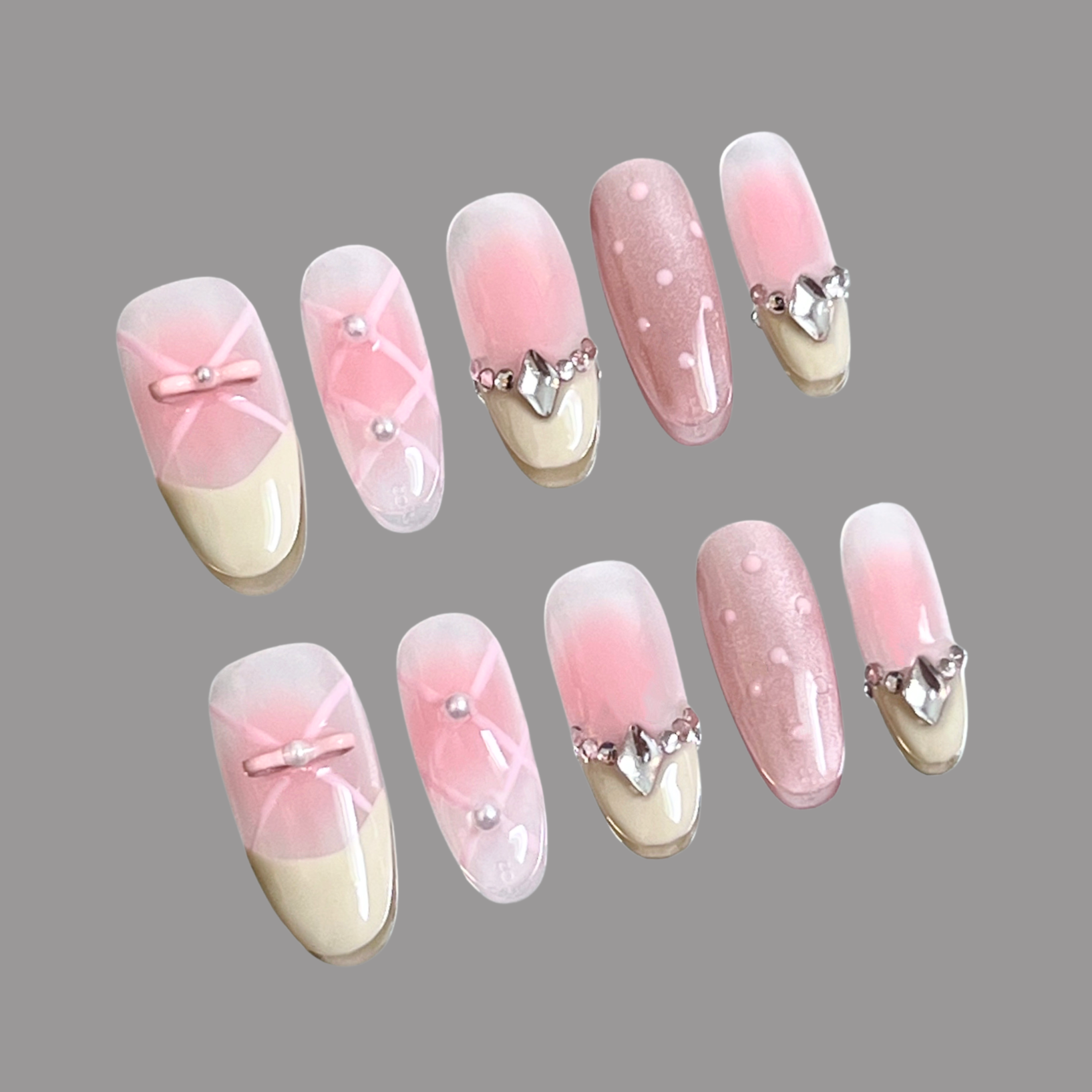 Step into a world of pastel charm with our ‘Candy Bow’ nails. Featuring a soft pink and white gradient, playful polka dots, and delicate ribbon accents, this design is completed with a hint of cat-eye shimmer and heart embellishments for a sweet, romantic touch.