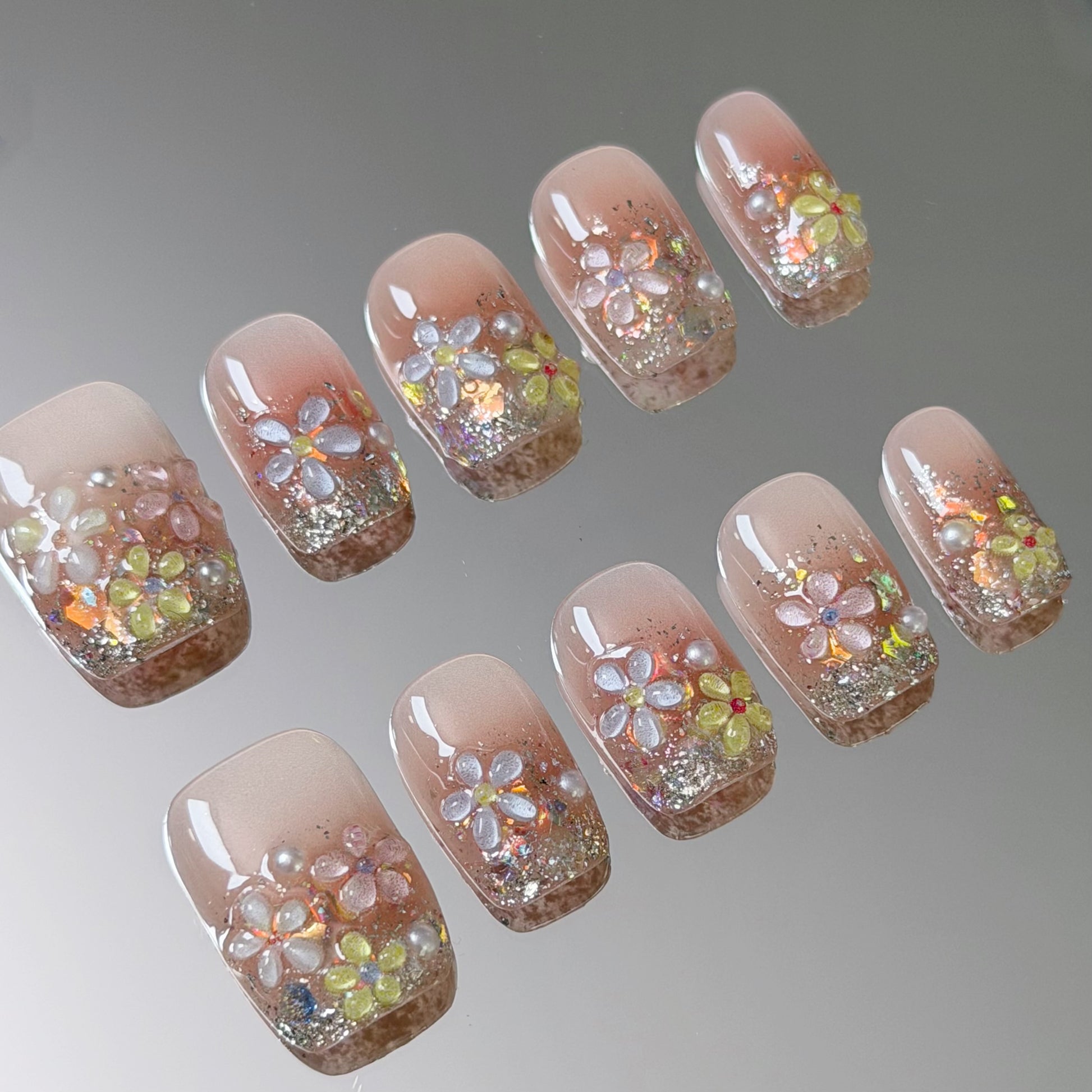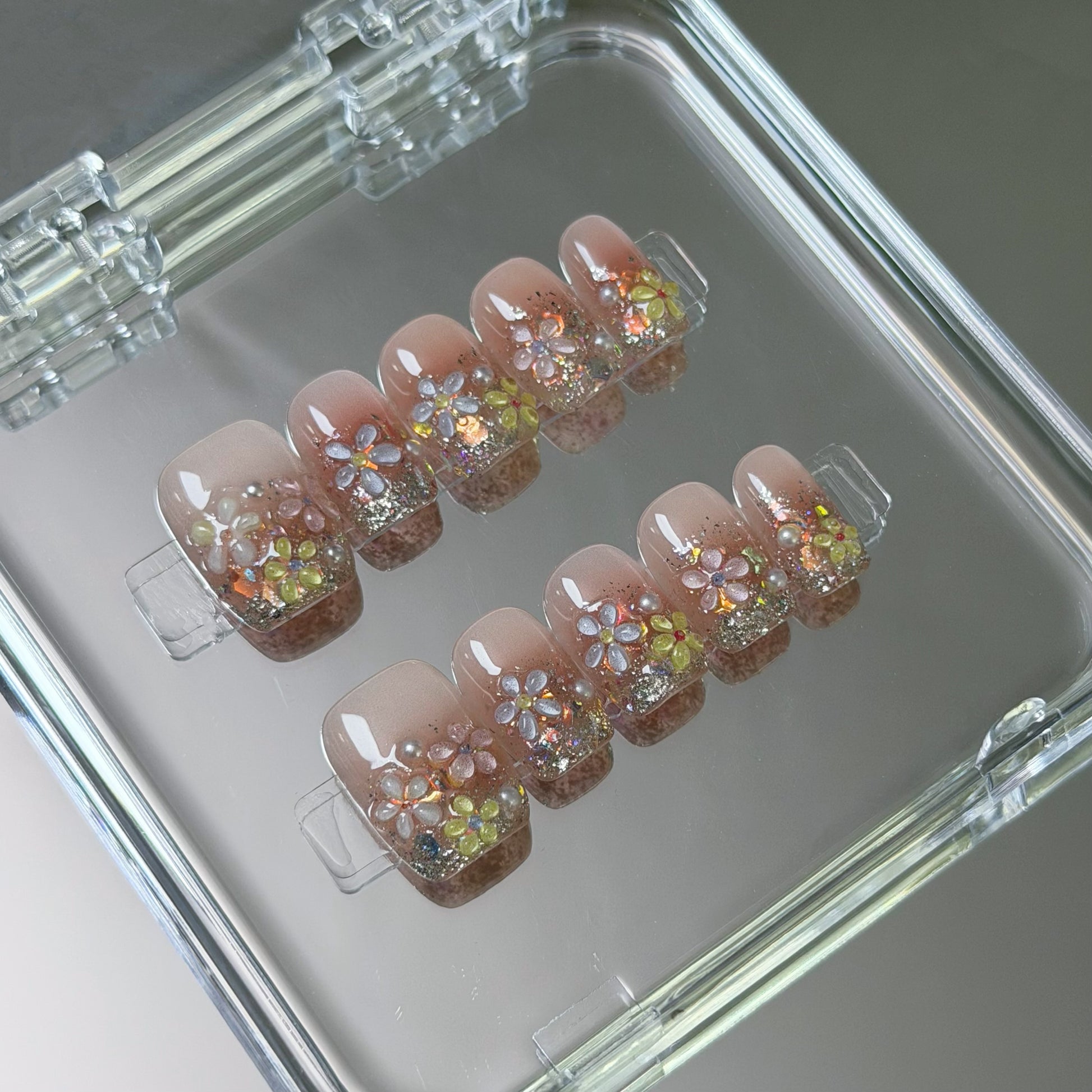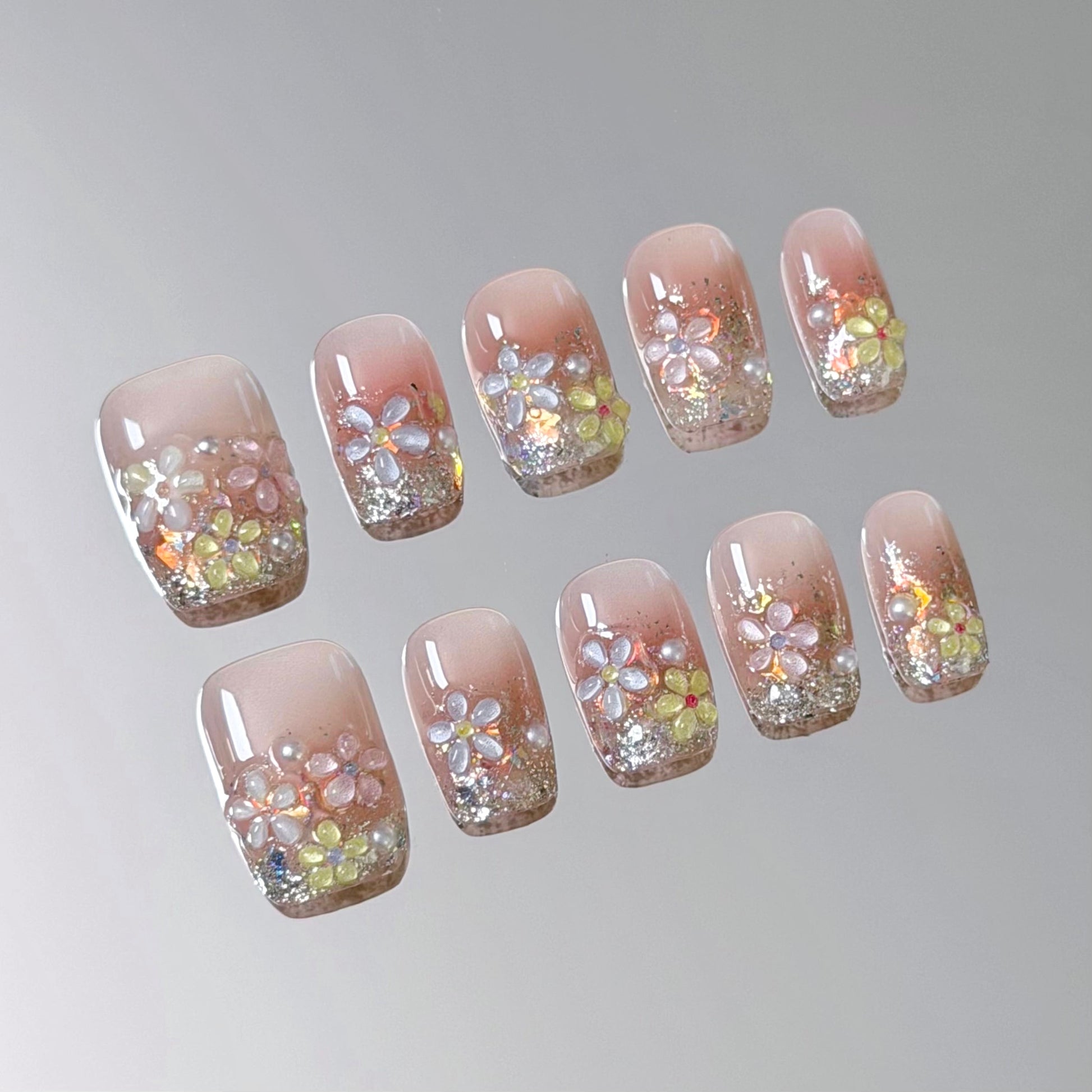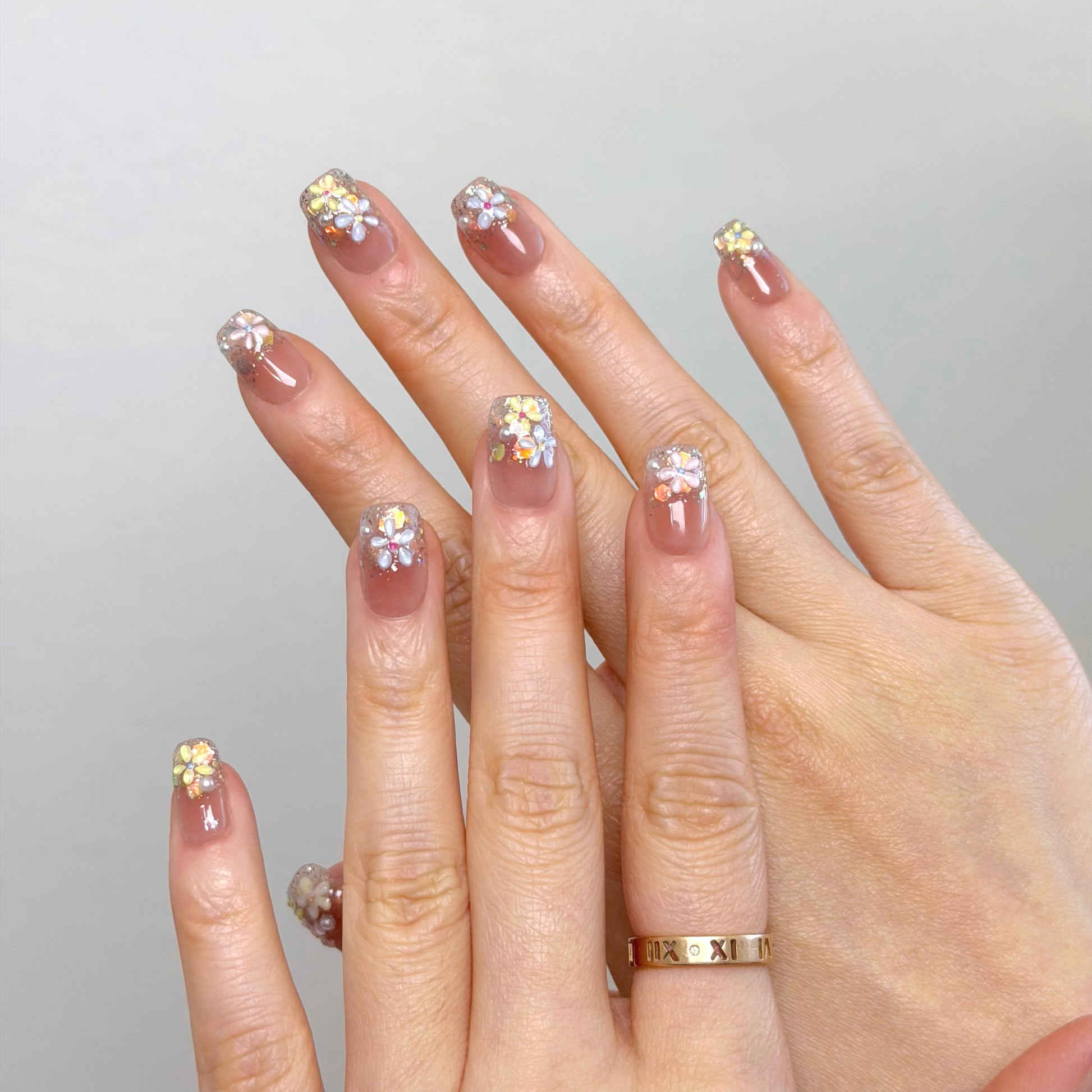 🌸Lumina blends soft nude tones dusted with silver shimmer and finished with tiny crystal blooms. Like moonlight resting on bare skin, this design is quiet, romantic, and effortlessly refined. A subtle sparkle that reveals itself only when you move.