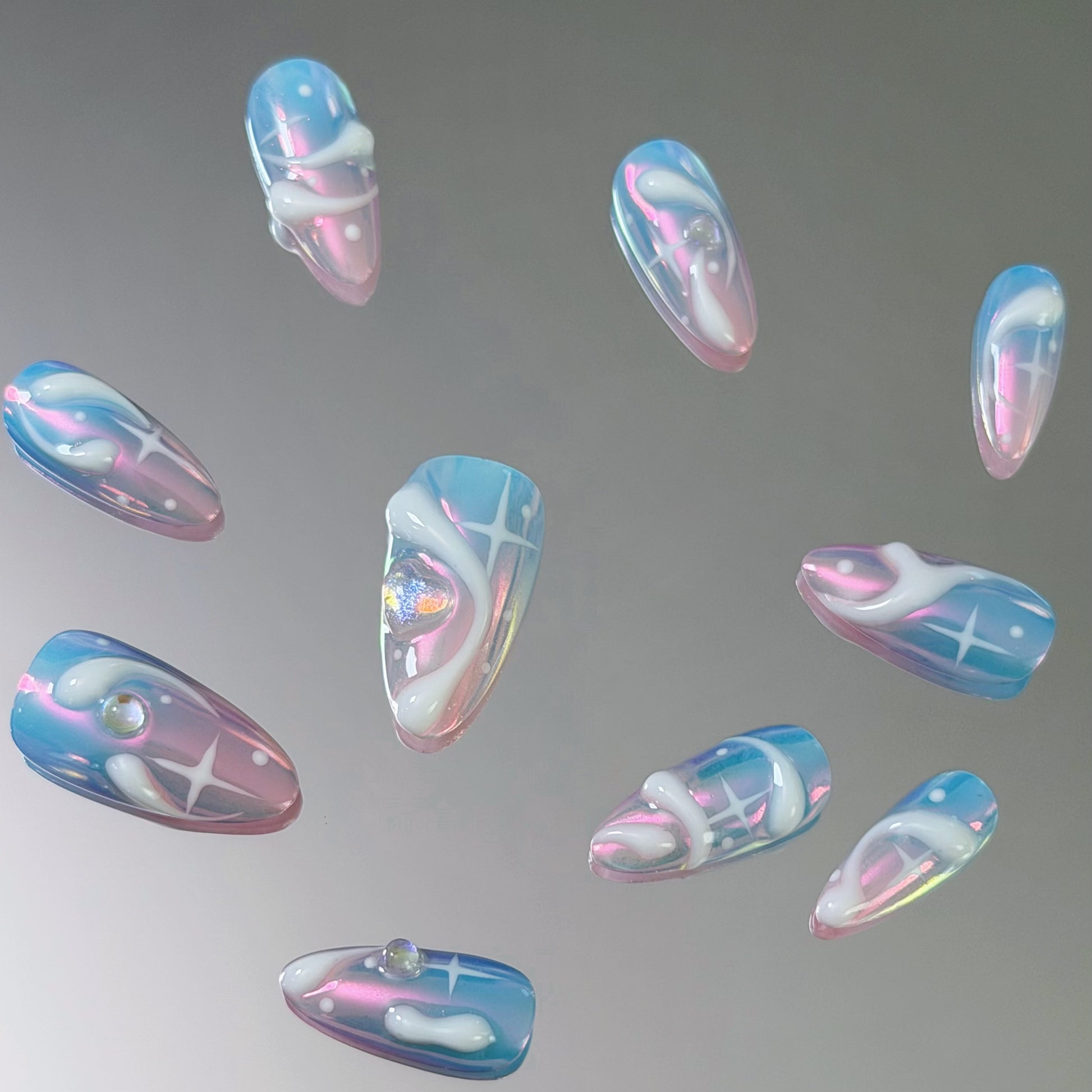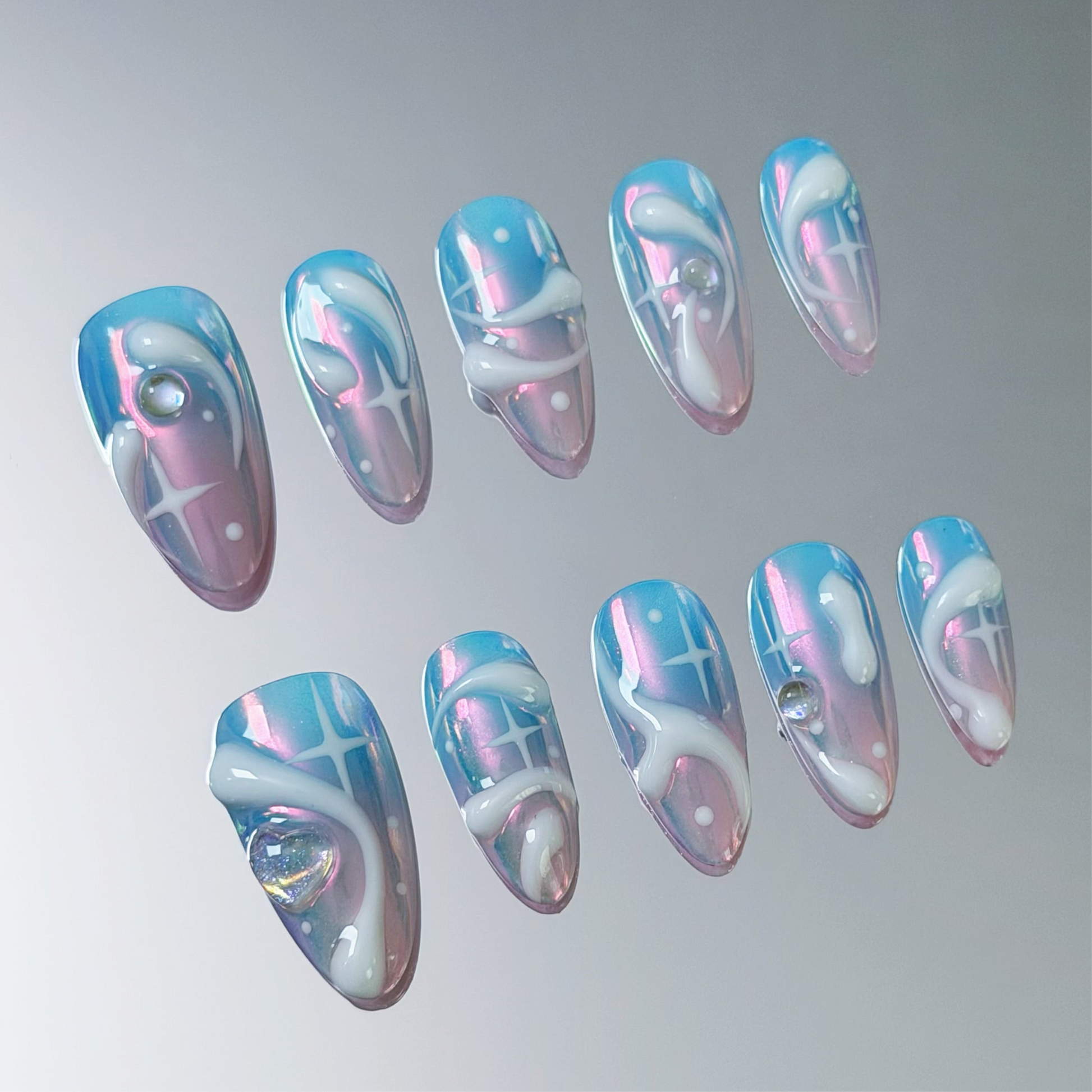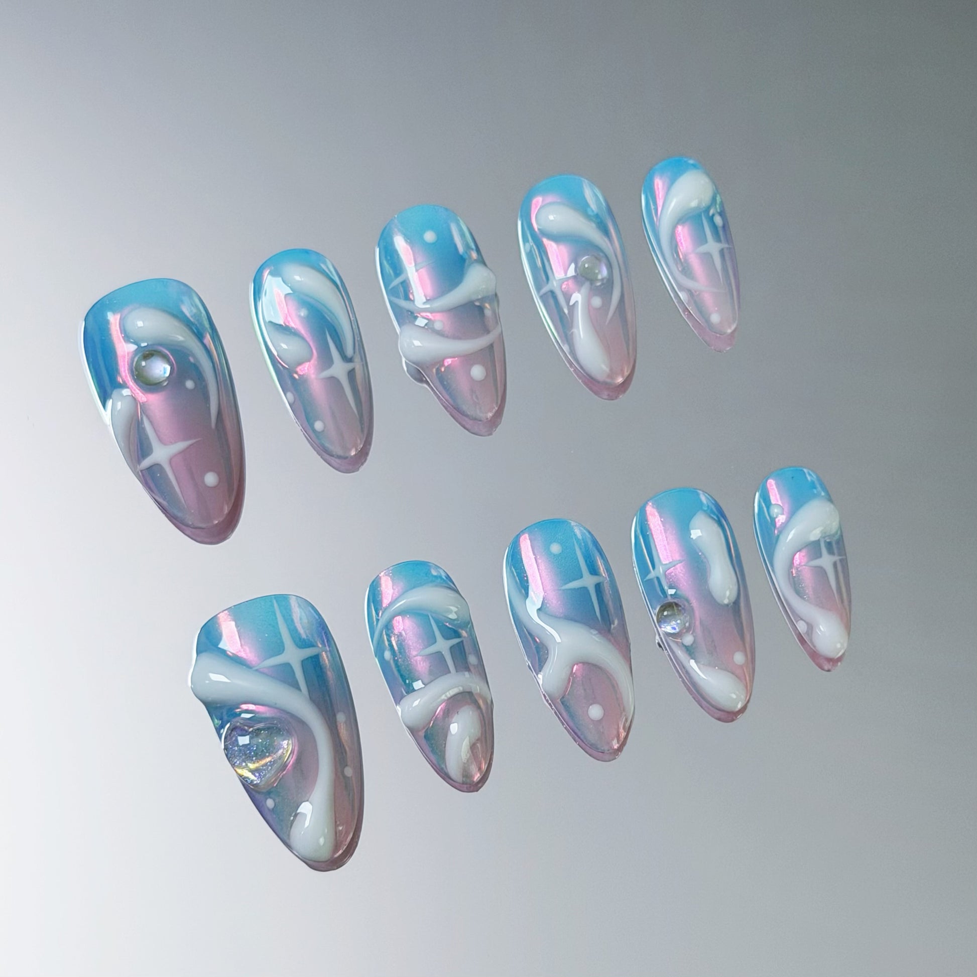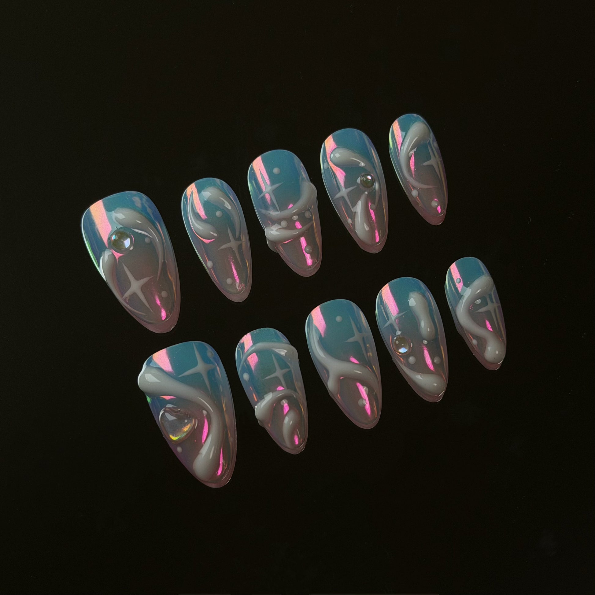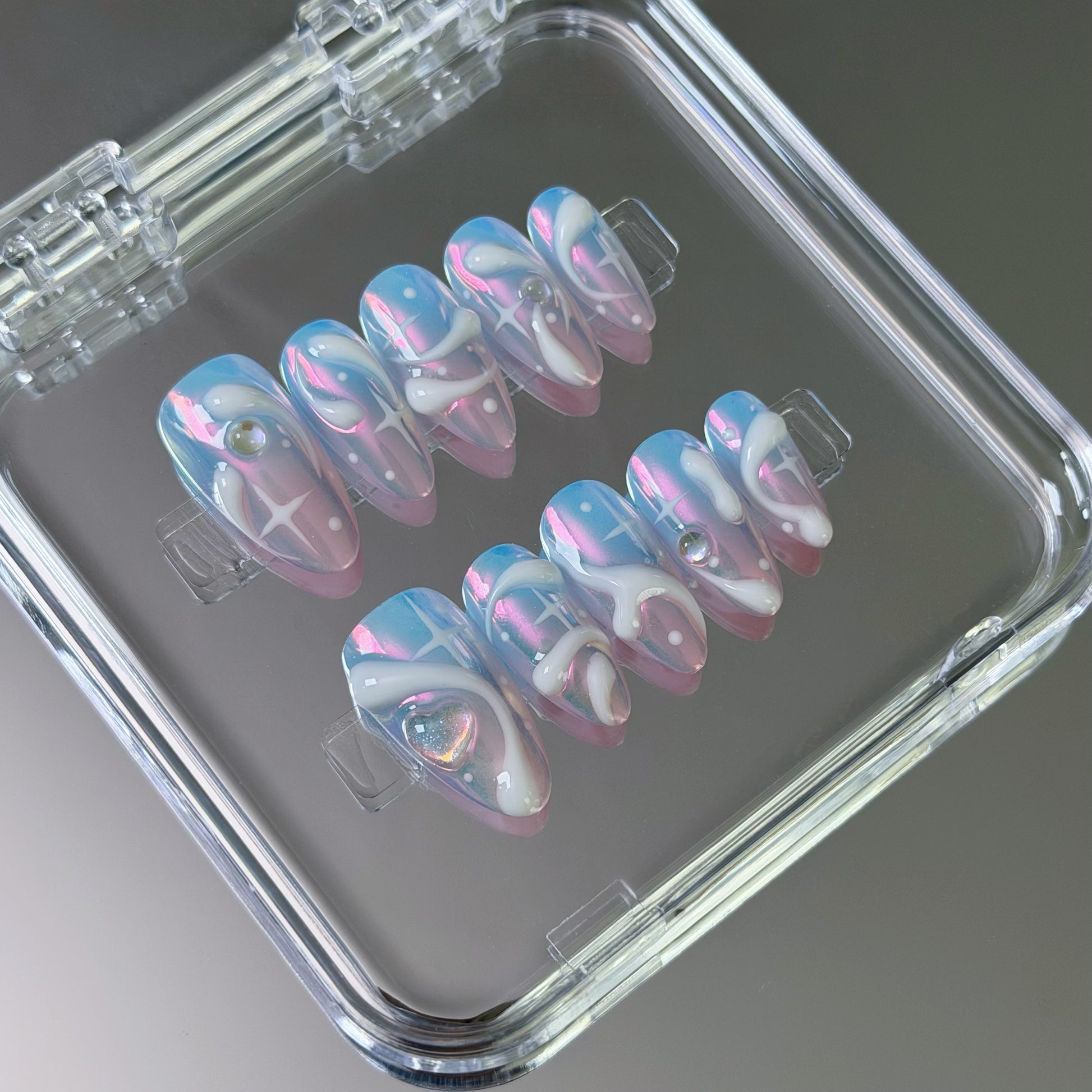 Milky 3D cloud-like swirls flow across the surface, accented with starlight, translucent hearts, and crystal-clear bubbles.Ethereal, romantic, and softly luminous—like bubbles drifting beneath an aurora-lit sky.