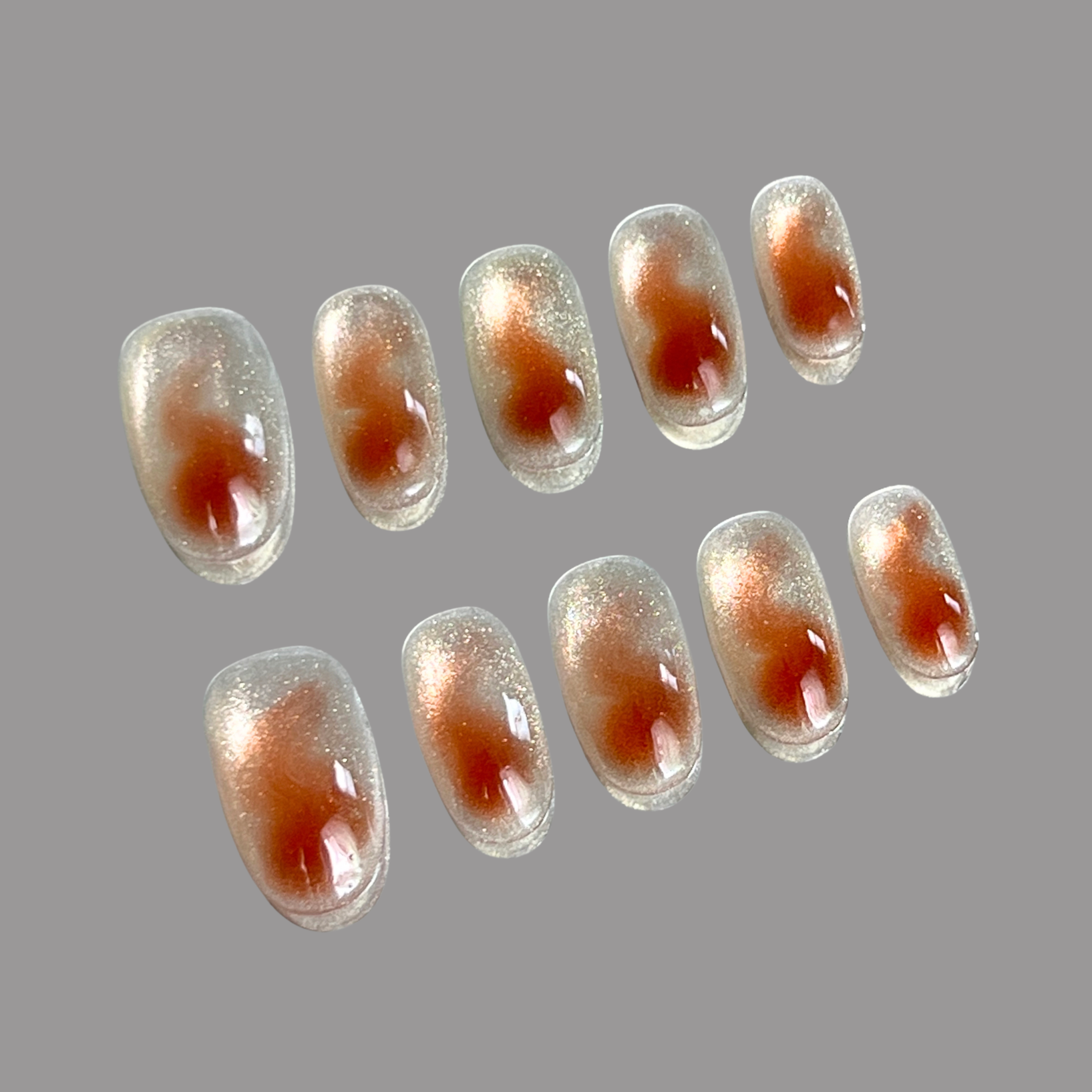 Introducing “Goldfish” - a whimsical blend of elegance and charm. This short oval-shaped nail set features a shimmering silver base with a mesmerizing golden cat-eye glow, beautifully accented by soft orange hues reminiscent of delicate goldfish scales glistening under sunlight.