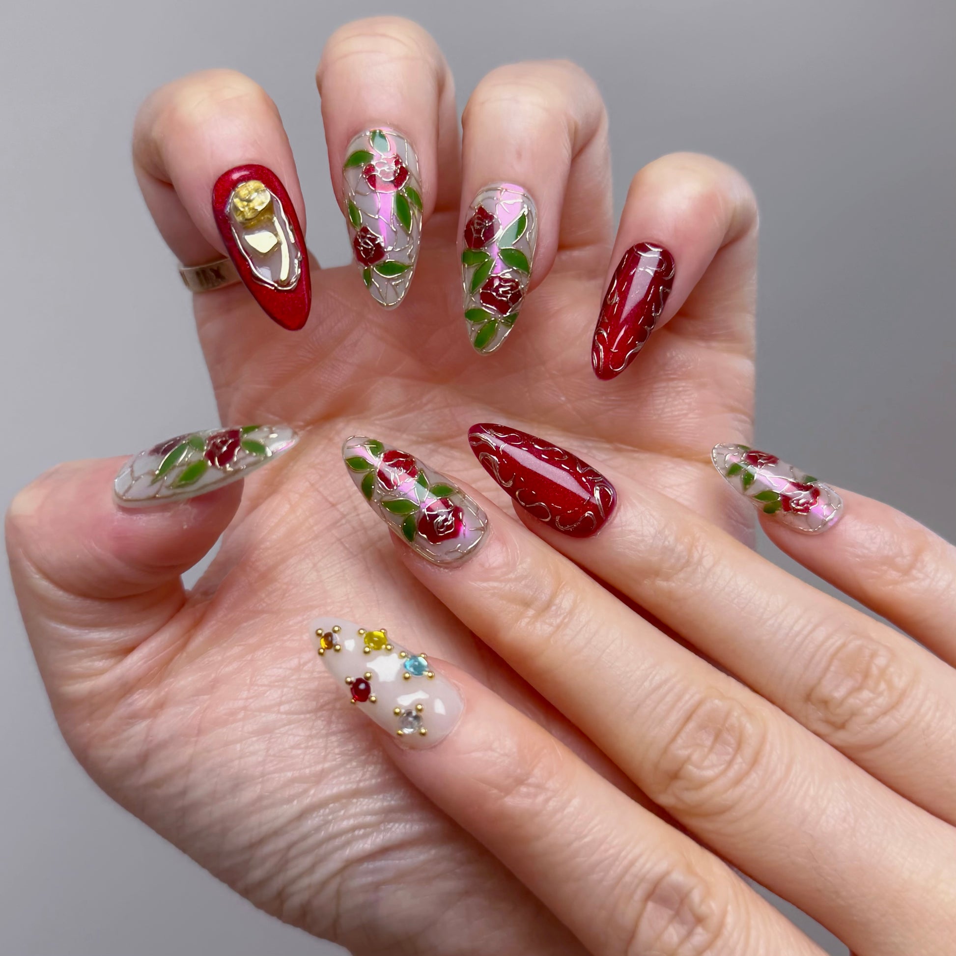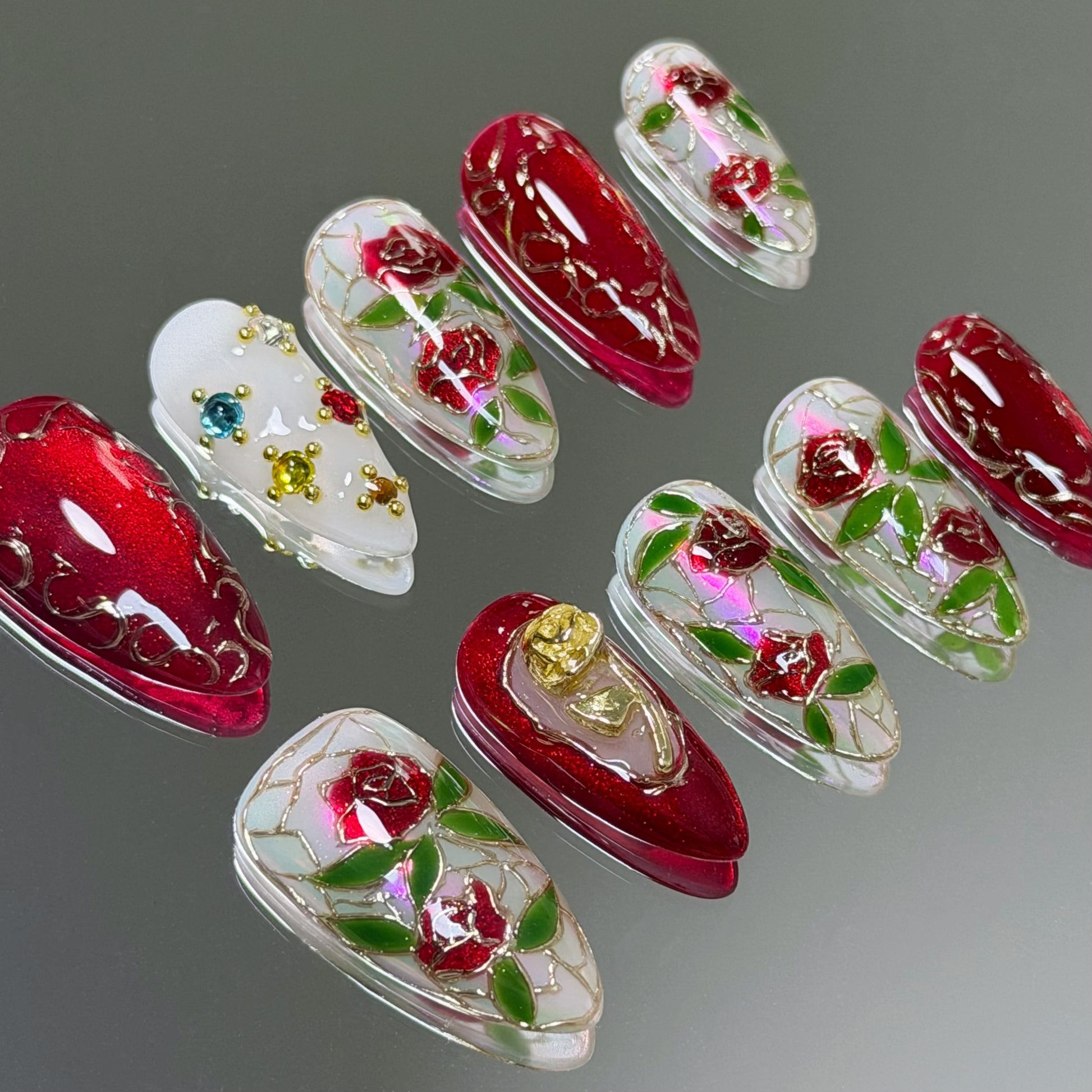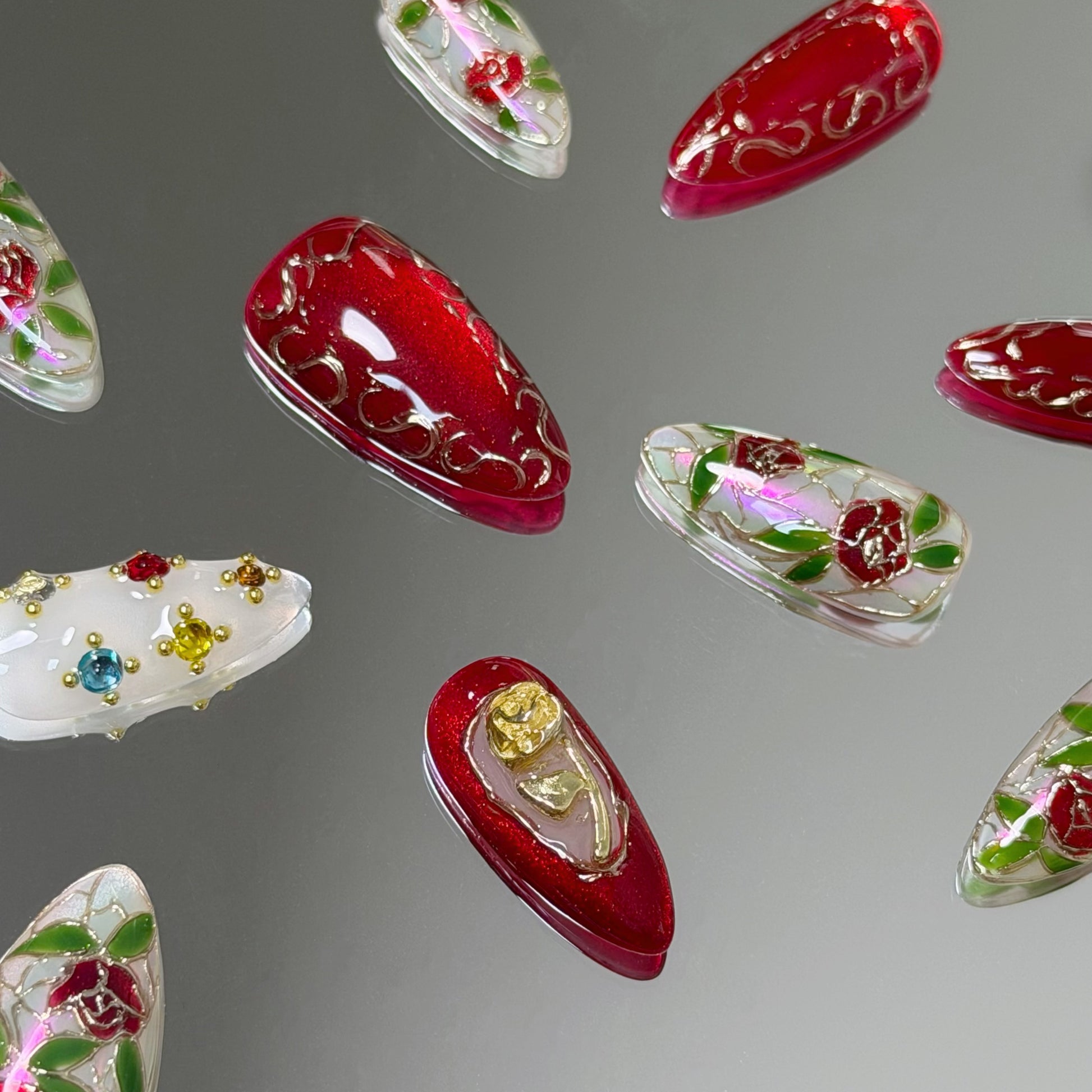 🌹Inspired by the timeless beauty of stained glass artistry, Luminé Rose blends intricate craftsmanship with a regal vintage charm. Five nails feature a soft teal base layered with pink-shift aurora powder, hand-painted roses, and gold mirror-powder outlines — evoking the gilded edges of classic stained glass panels. Rich crimson accents pair with shimmering gold cat-eye gel, detailed with ornate golden motifs for added depth and luxury. A standout nail frames a sculpted gold rose at its center, resembling a precious bloom preserved within an antique miniature frame. Elegant, opulent, and artfully nostalgic — a true statement piece for vintage lovers.✨