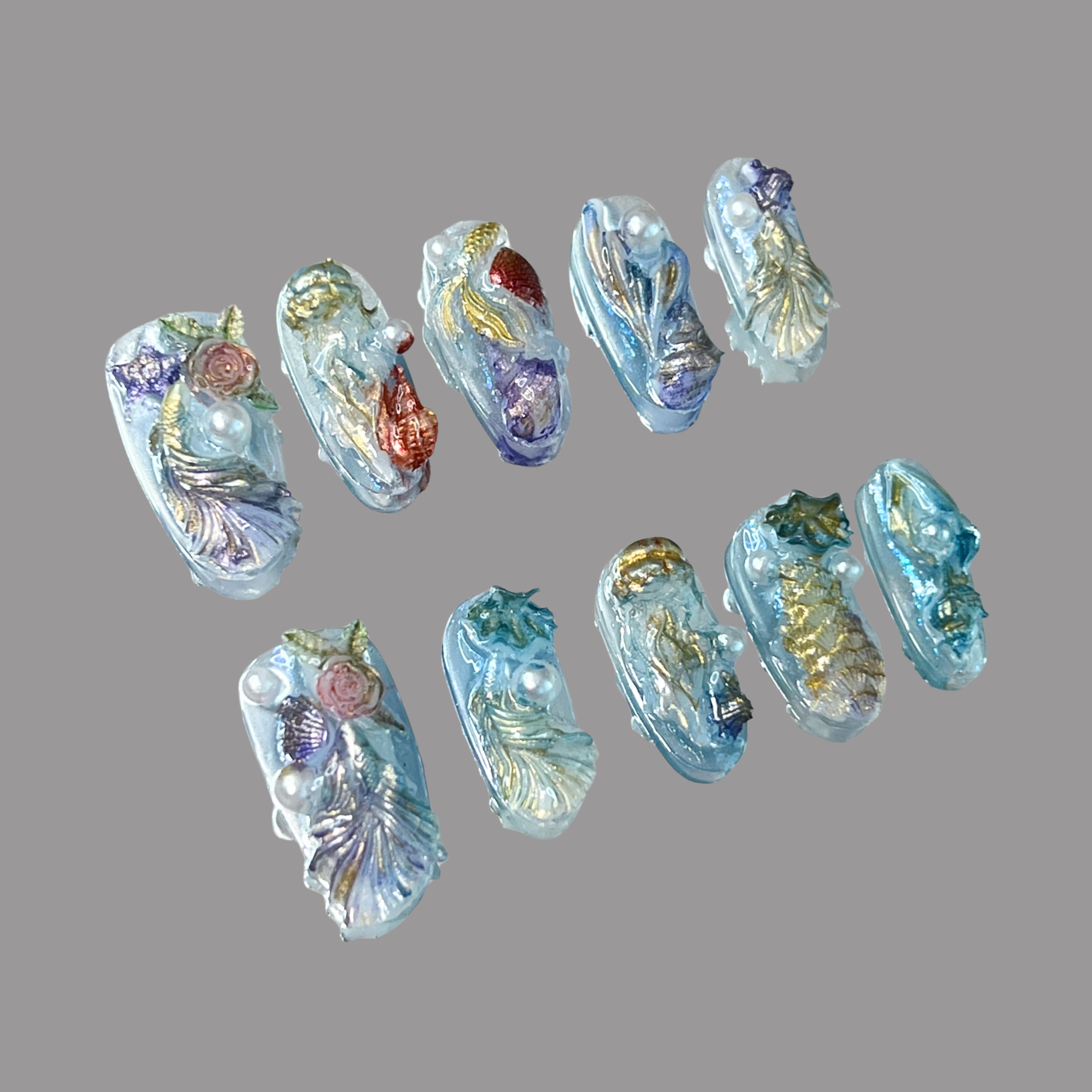 🪸Dive into the depths of an enchanting seascape with Mystic Reef, a 2cm medium oval design featuring a captivating blend of blue and violet gradients. Intricate 3D corals and seashells rise from the surface, each hand-detailed with shimmering gold accents. The result is a deep-ocean fantasy — rich, mysterious, and impossibly elegant.