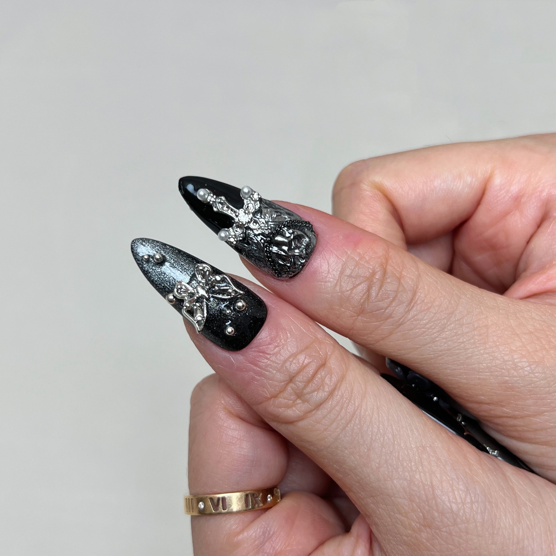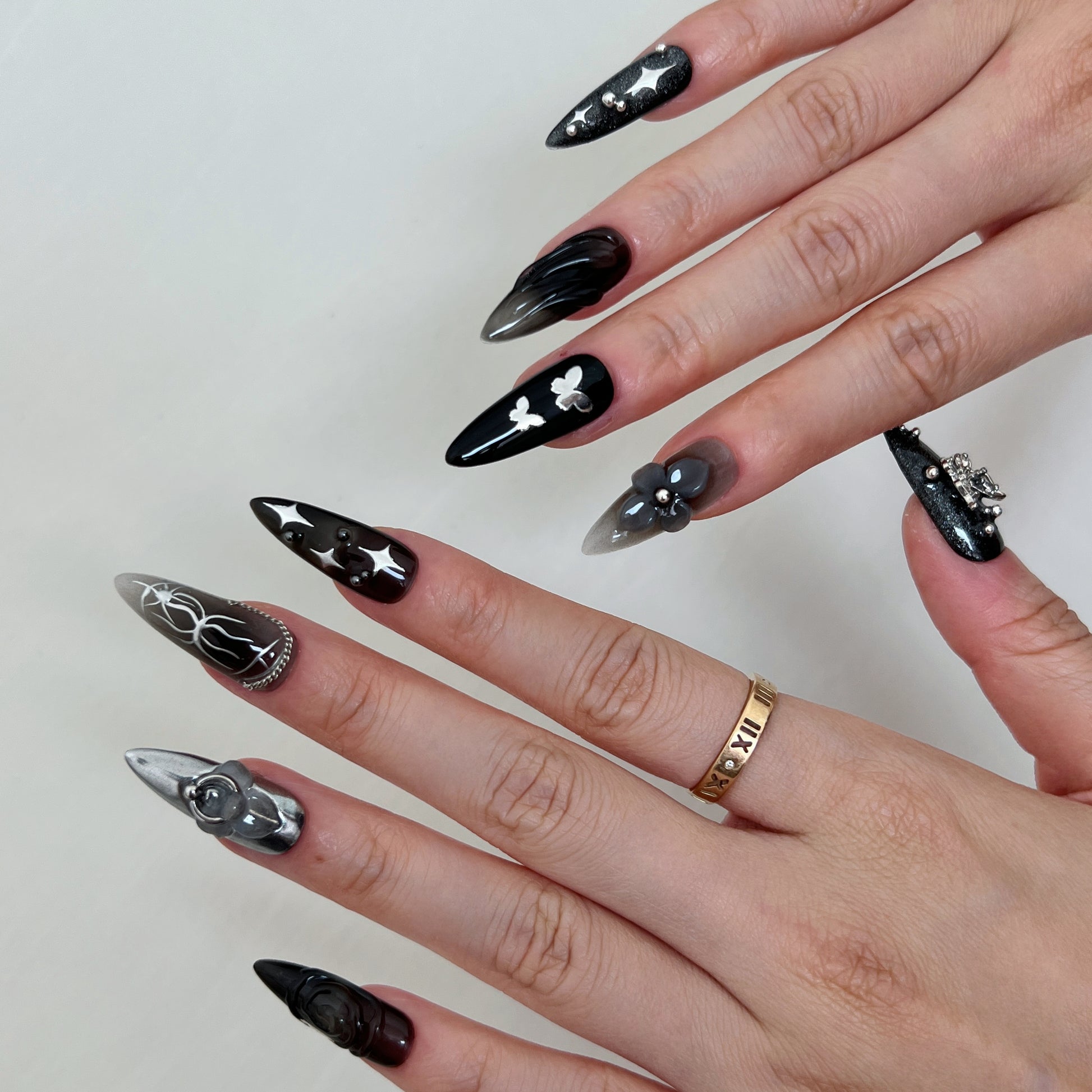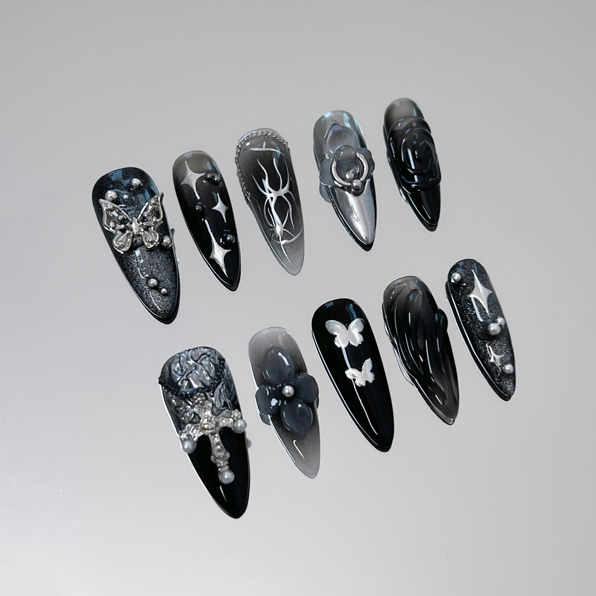 🦋Phantom Orchid blooms in the twilight between elegance and rebellion. A black-to-silver gradient shimmers beneath a cascade of crushed diamond sparkle, while a sculpted orchid unfurls in the shadows, crowned with a bold silver ring. The mirrored butterfly and metallic hues reflect an untamed grace—deep, hypnotic, and dangerously beautiful.