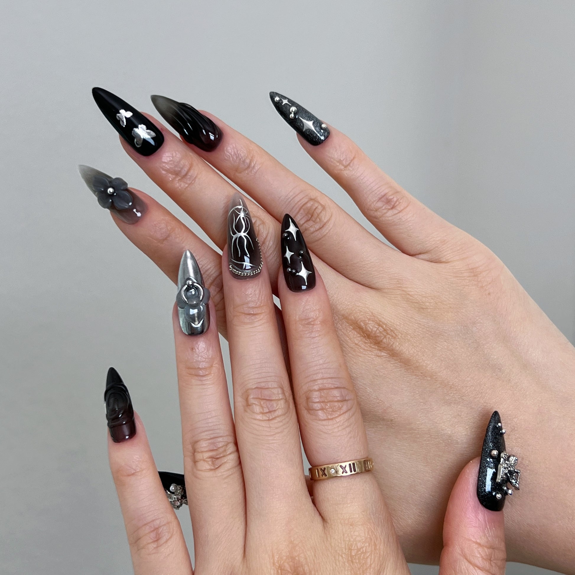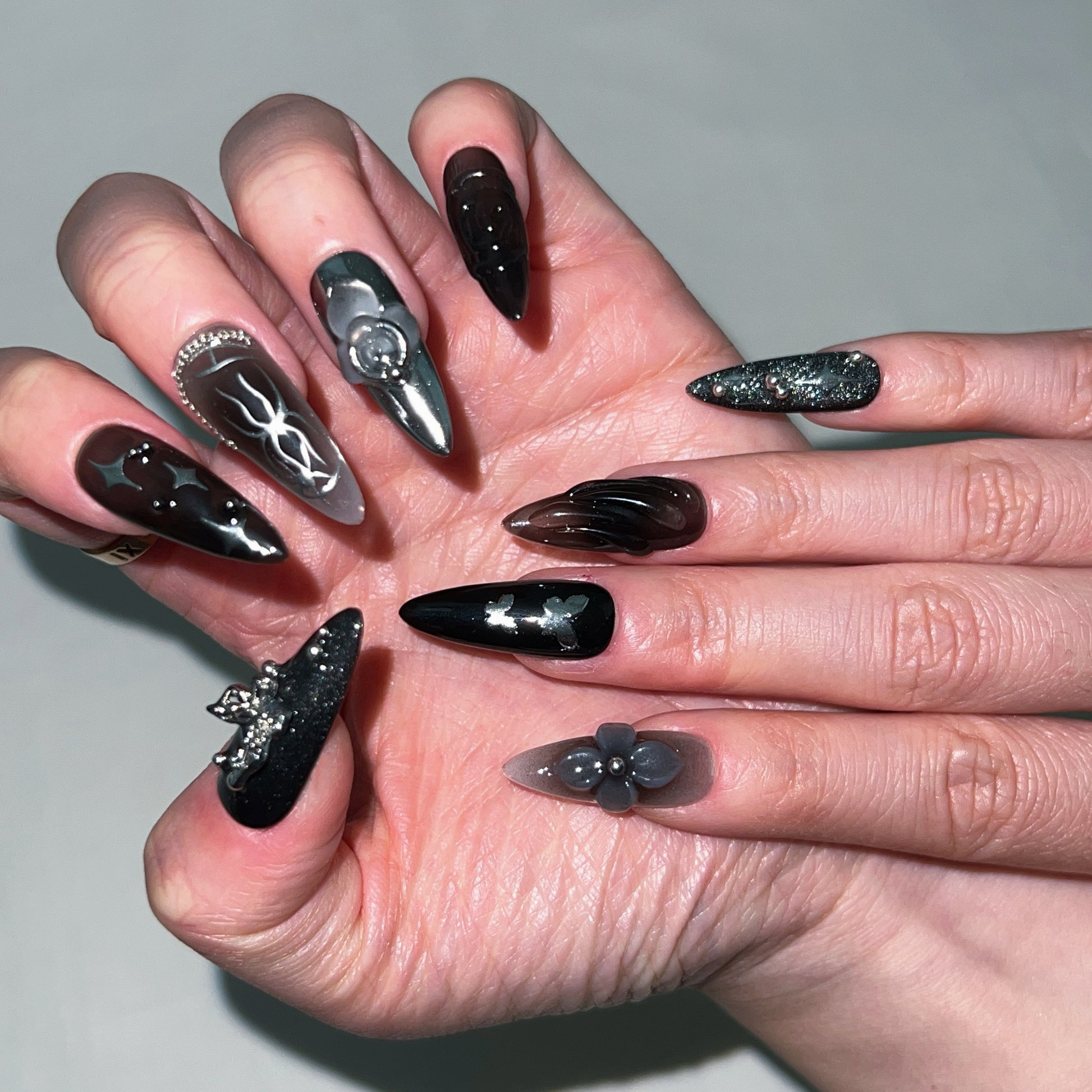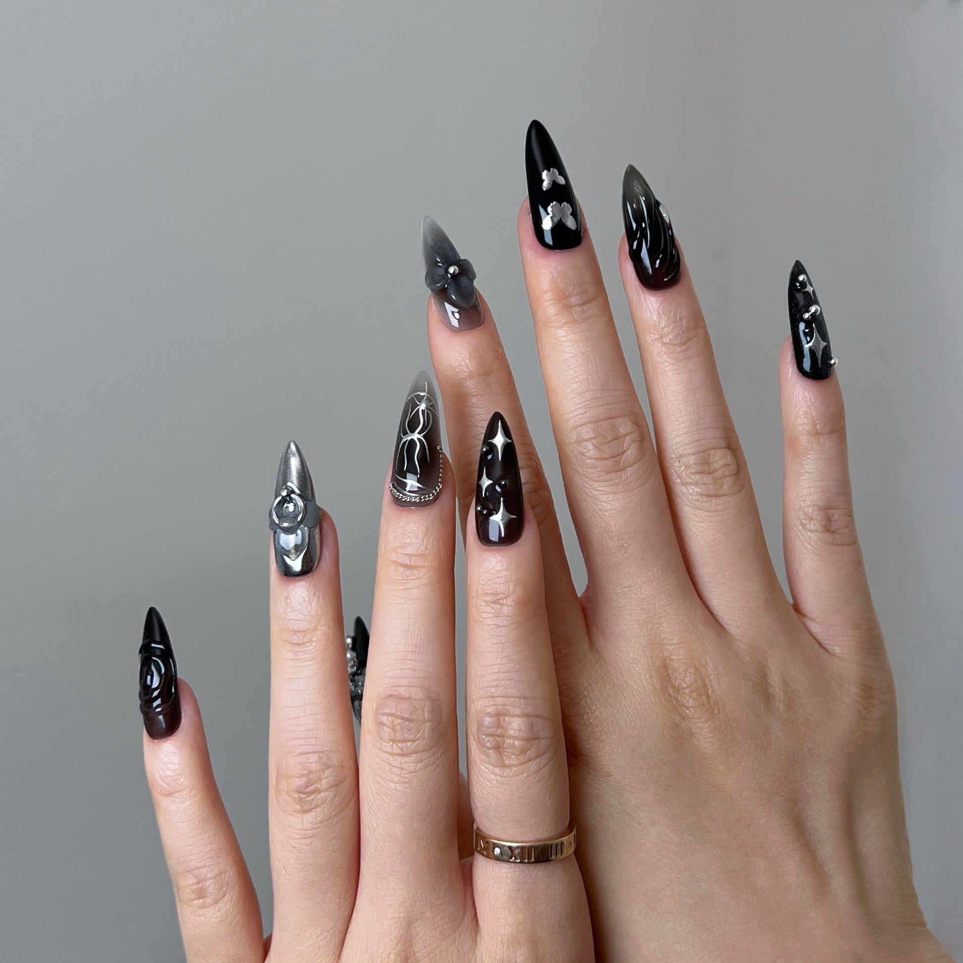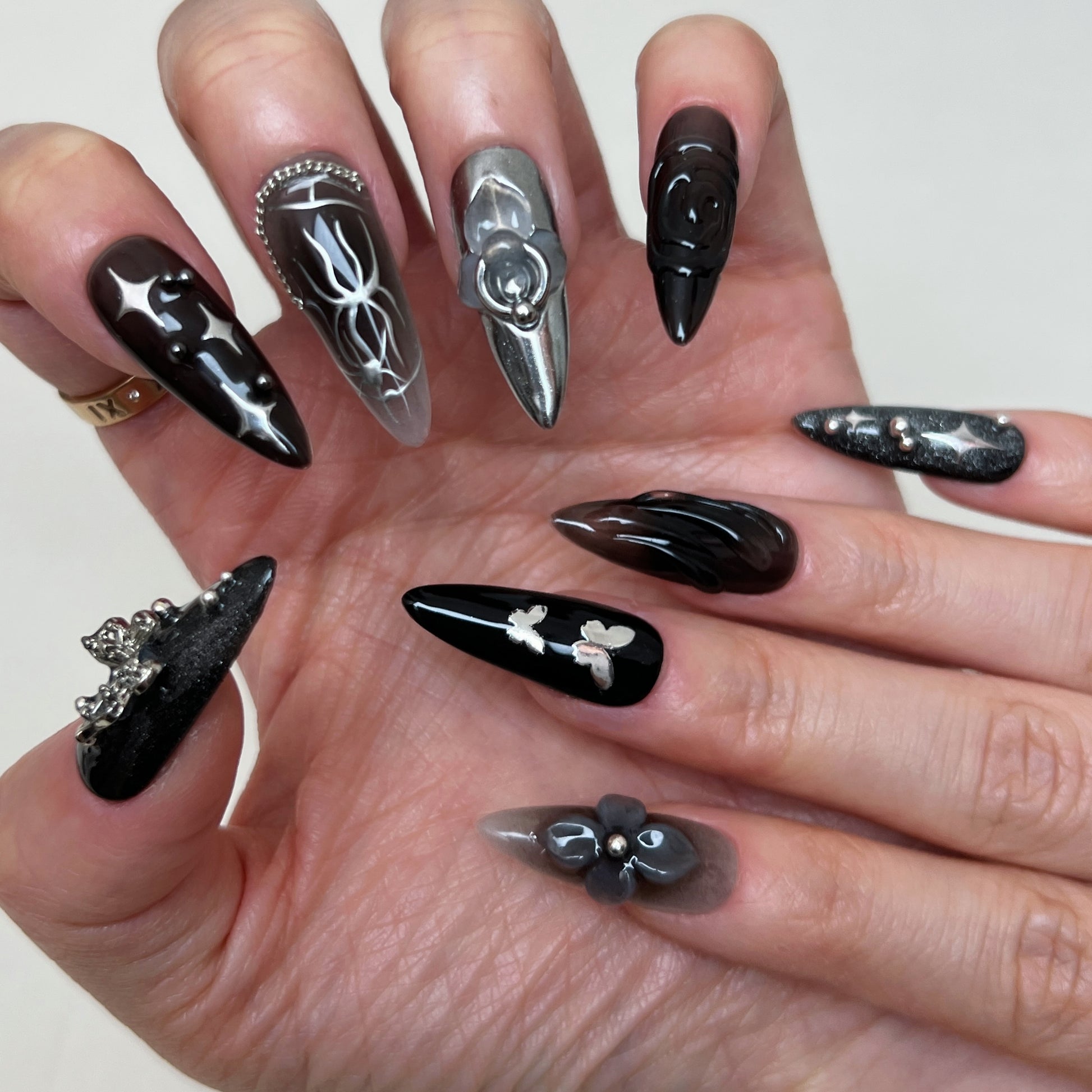 🦋Phantom Orchid blooms in the twilight between elegance and rebellion. A black-to-silver gradient shimmers beneath a cascade of crushed diamond sparkle, while a sculpted orchid unfurls in the shadows, crowned with a bold silver ring. The mirrored butterfly and metallic hues reflect an untamed grace—deep, hypnotic, and dangerously beautiful.