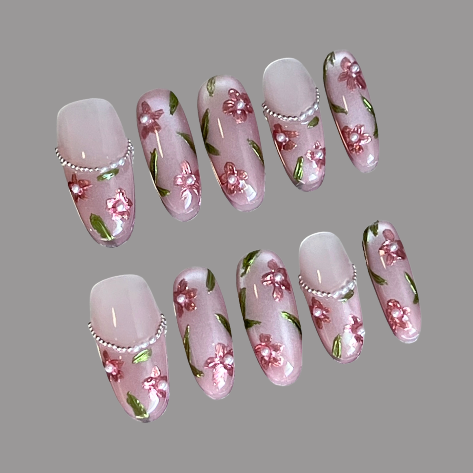 Embrace timeless elegance with our ‘Qipao’ nails. Inspired by the intricate beauty of embroidered silk, this design features a delicate nude pink base with a subtle cat-eye sheen. Hand-painted floral accents and dainty pearl embellishments add a touch of sophistication, making it a perfect choice for those who adore graceful, refined style.