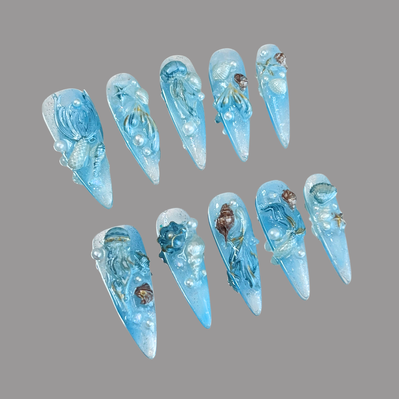 🌊Embark on a deep-sea daydream with Siren’s Tale — a design crafted in soft ocean blue, sprinkled with milky white shimmer and golden flecks. Each nail tells a story through intricate 3D sculptures: seashells, starfish, mermaid tails, and floating jellyfish. With over 3 hours of hand detailing, this show-stopping set is more than a look — it’s a marine fantasy made to turn heads at any event.