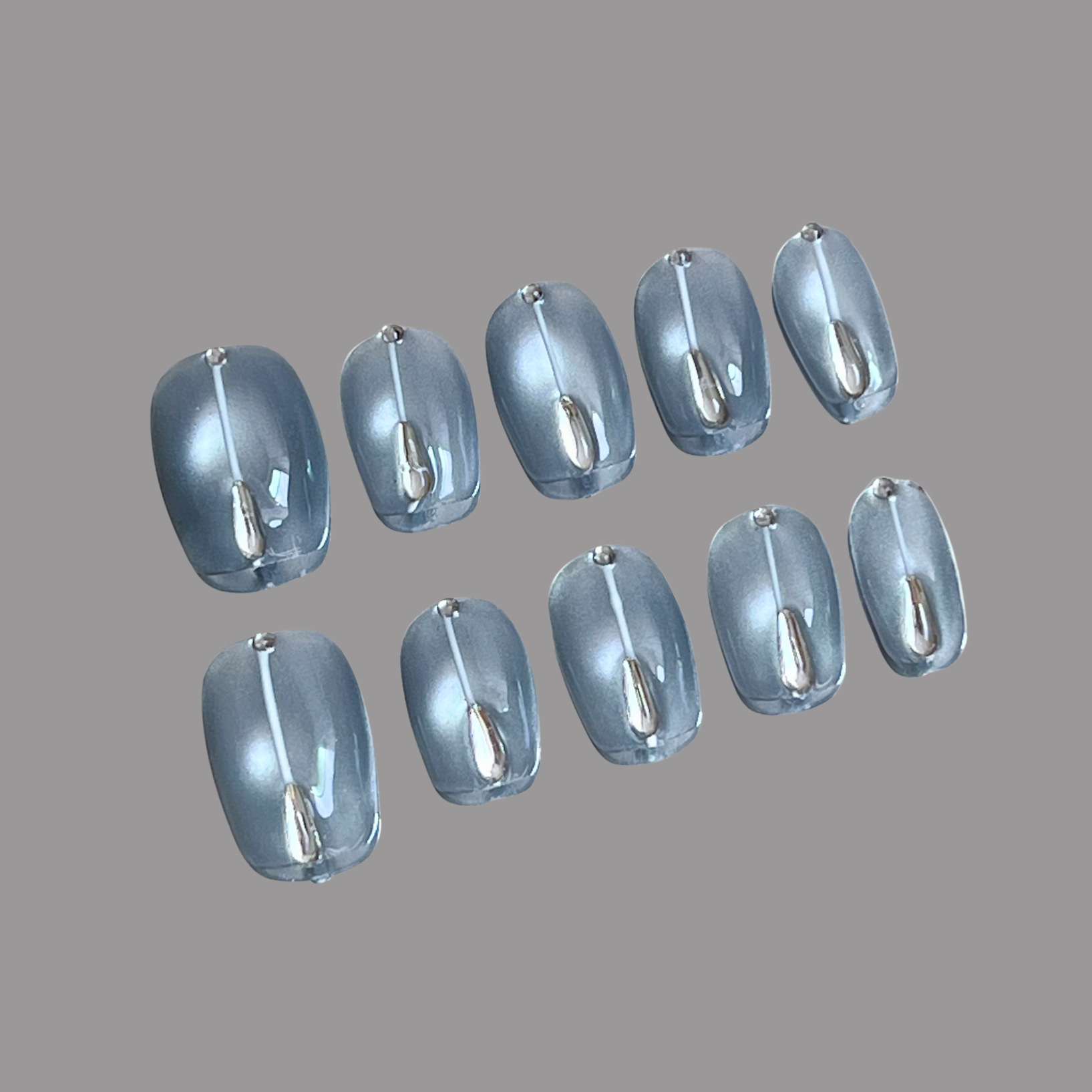 Discover understated elegance with our ‘Smoky Line’ nails. Featuring a translucent gray base and captivating cat-eye shimmer, the sleek vertical line adorned with delicate crystals creates a modern, sophisticated aesthetic.