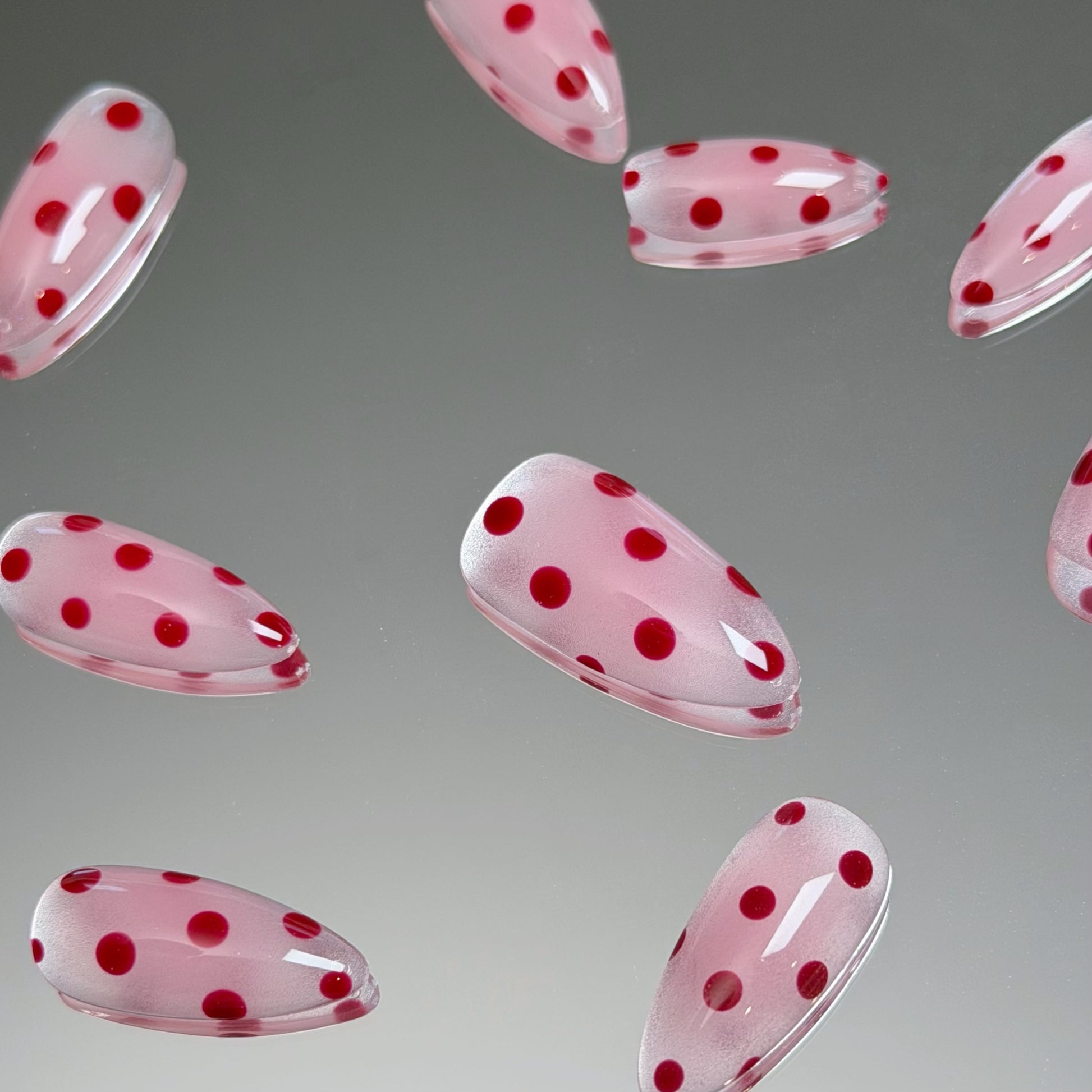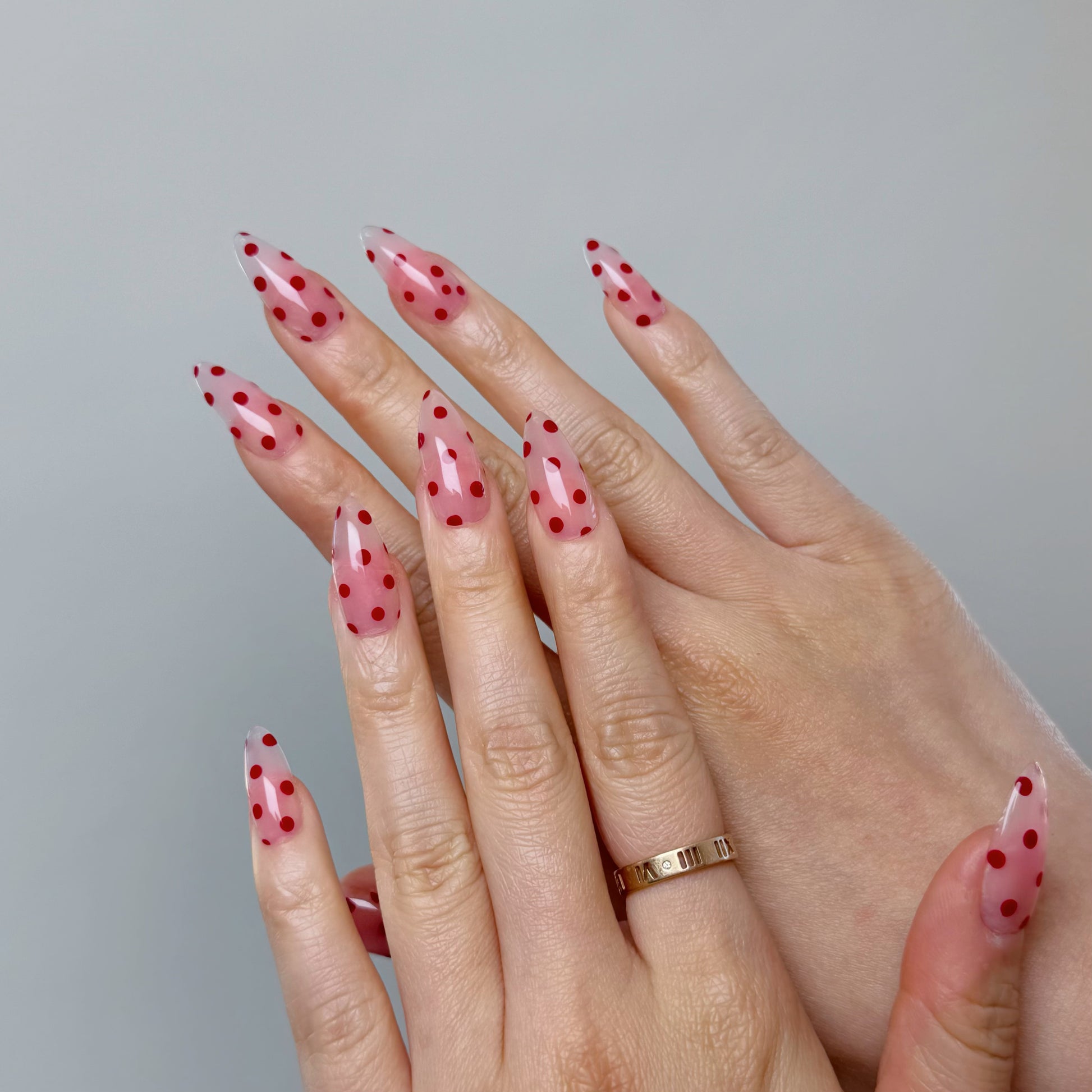 🎀Sweet Sprinkle features a sheer nude base with a soft pink center-blur gradient that diffuses gently toward the edges. Topped with bright red polka dots, this design delivers a playful touch of sweetness — festive enough for the holidays, yet effortlessly cute for everyday wear. Light, cheerful, and irresistibly charming.