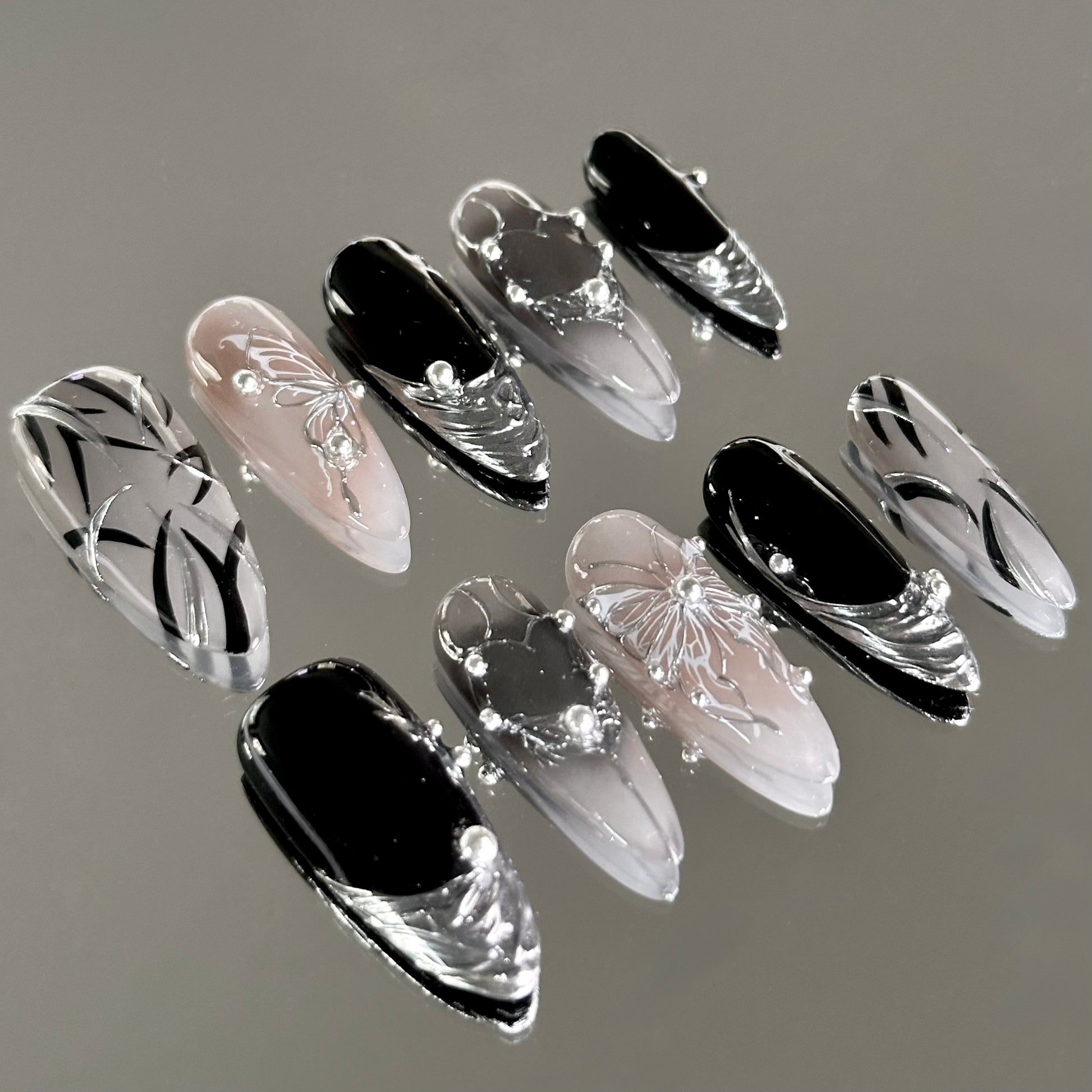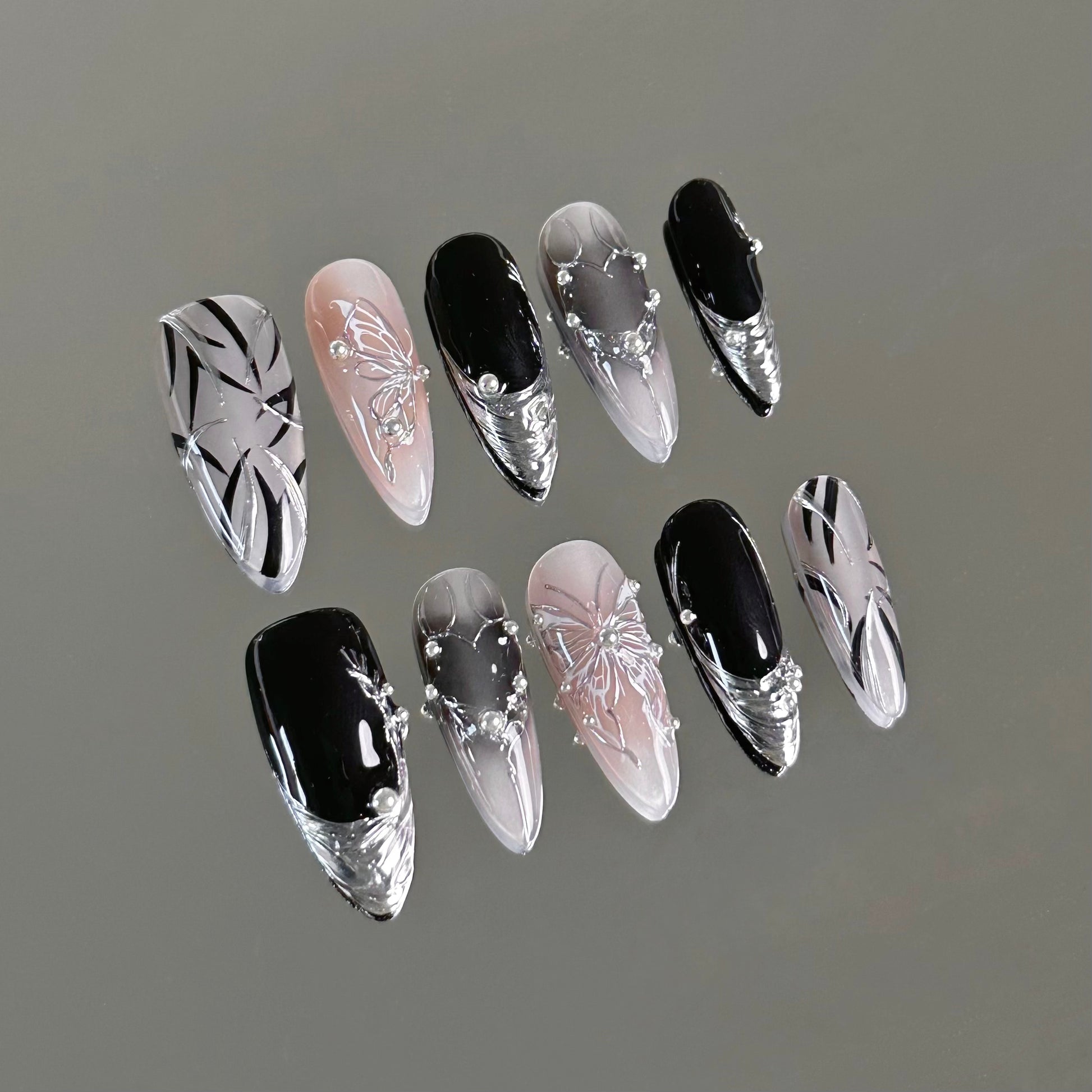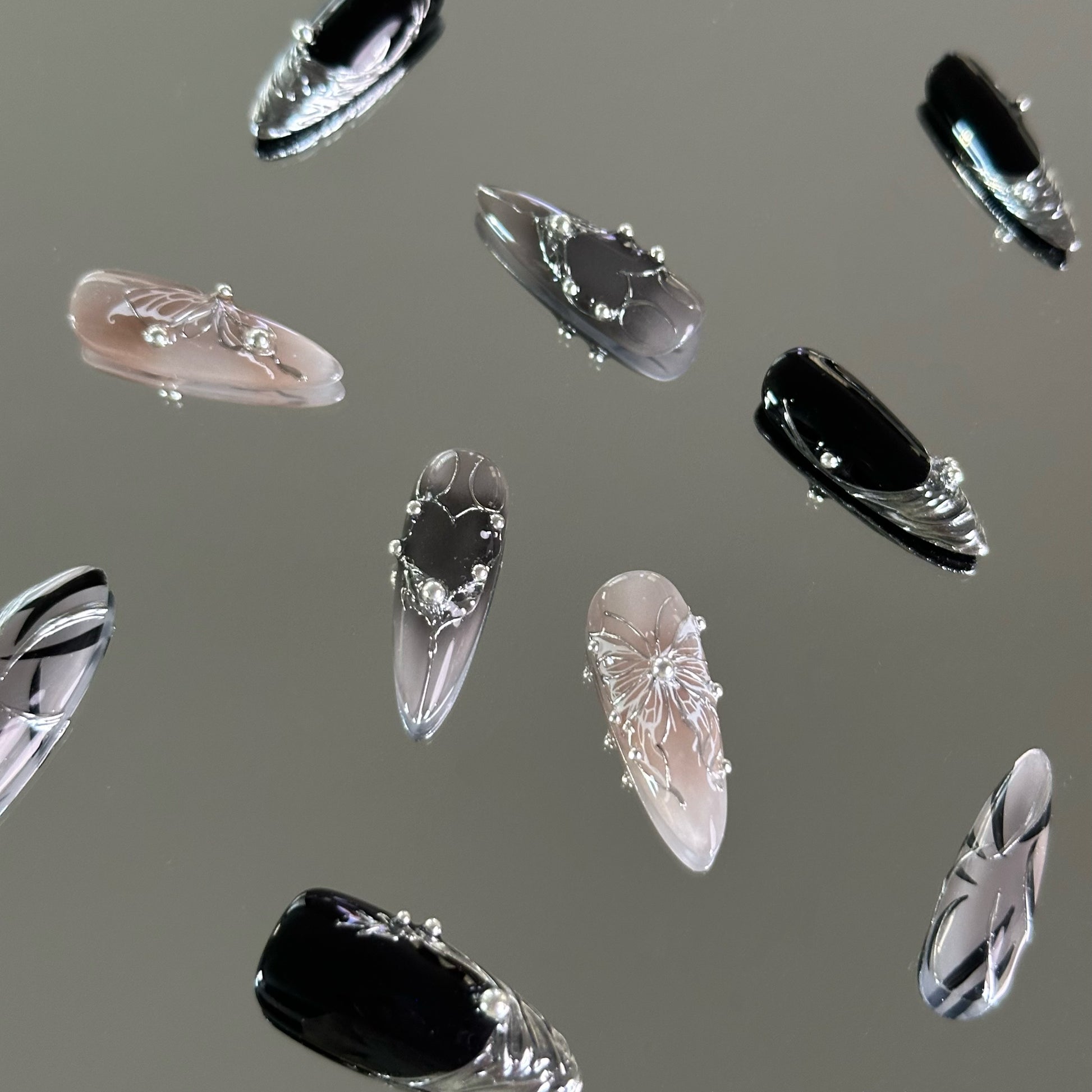 Thorned tells the story of beauty entwined with danger. Silver-lined butterflies spread their wings over a deep black base, glimmering with metallic light. Tiny steel beads and a barbed heart accent add a touch of rebellion, blending elegance with a hint of forbidden desire. Like love that cuts and heals all at once—dark, delicate, and unforgettable.