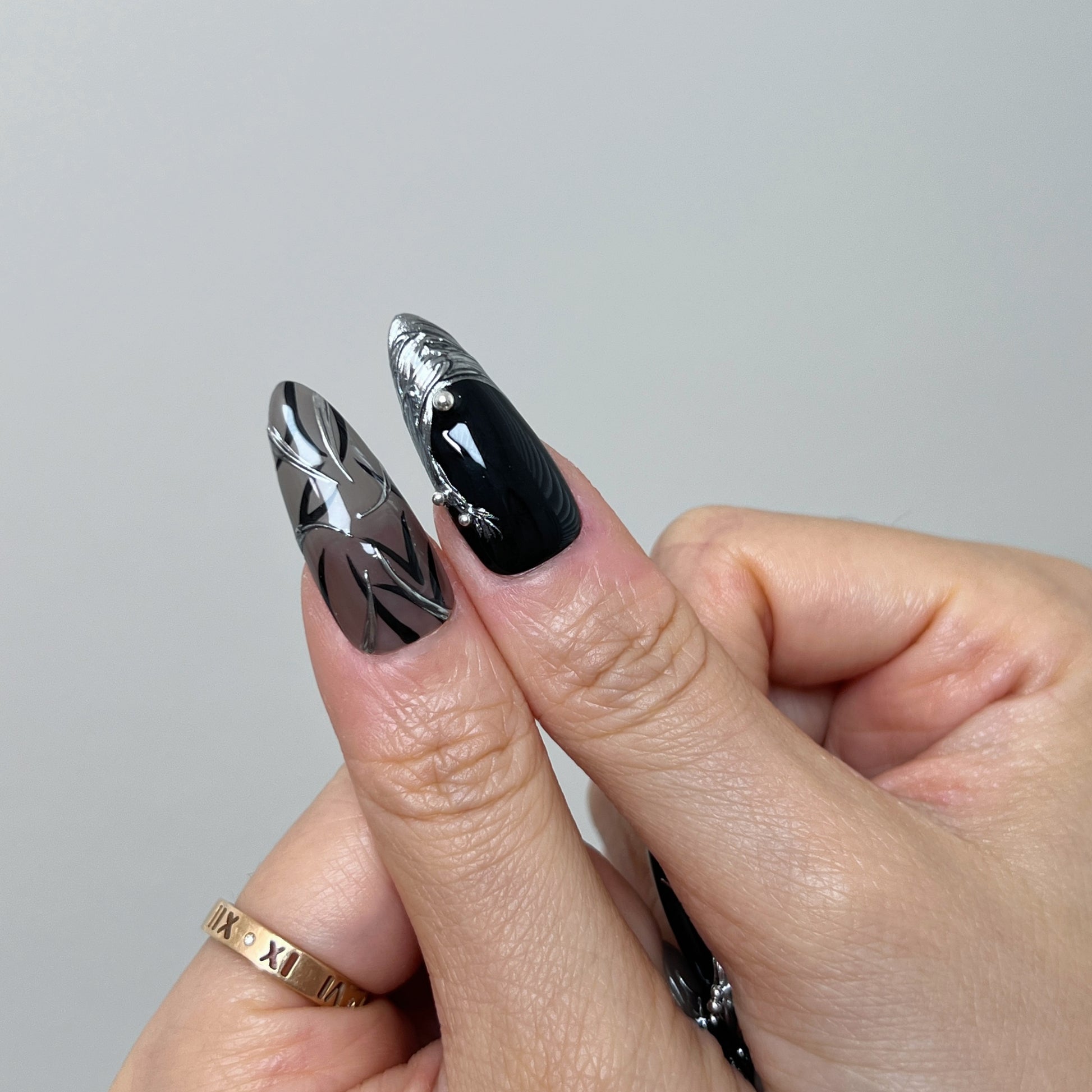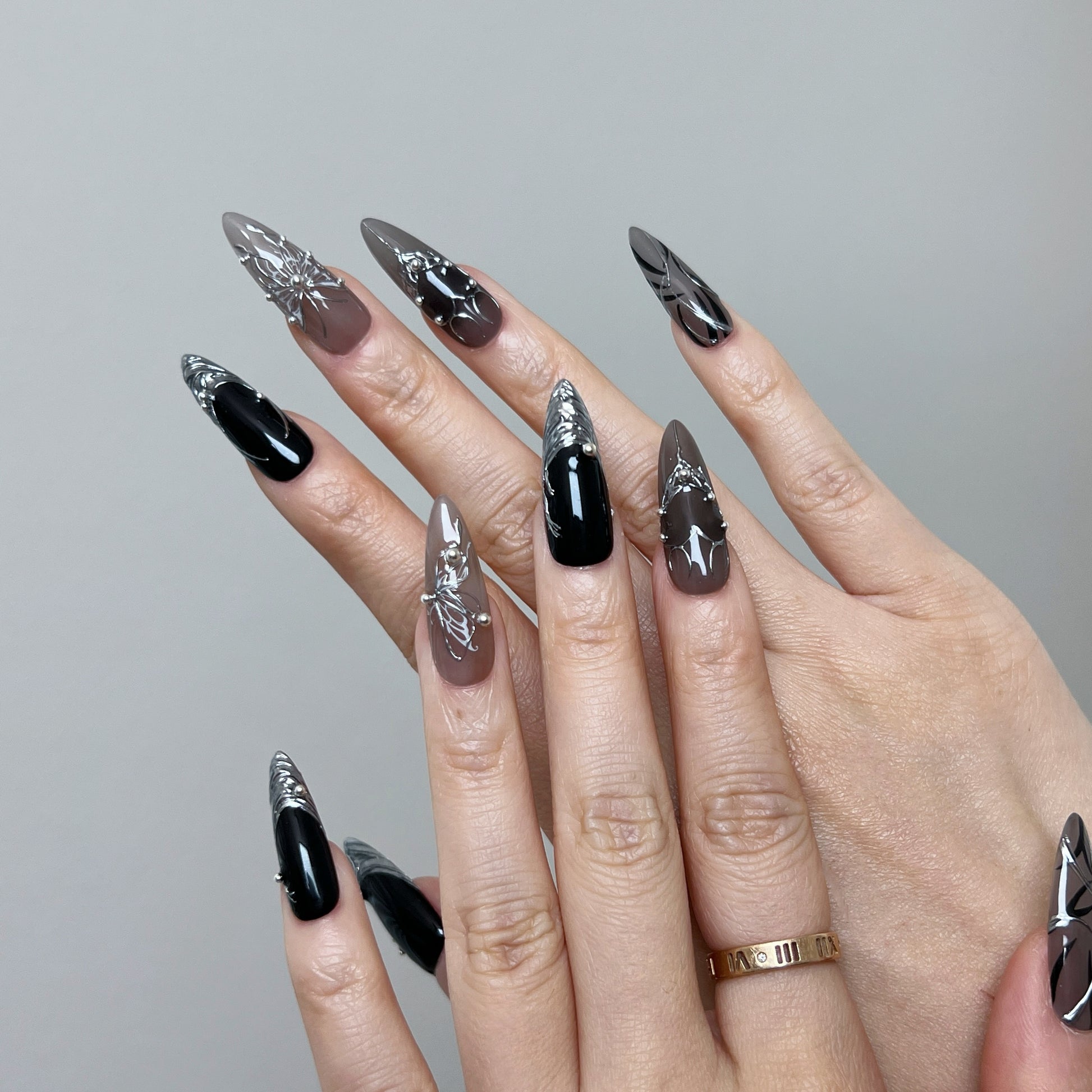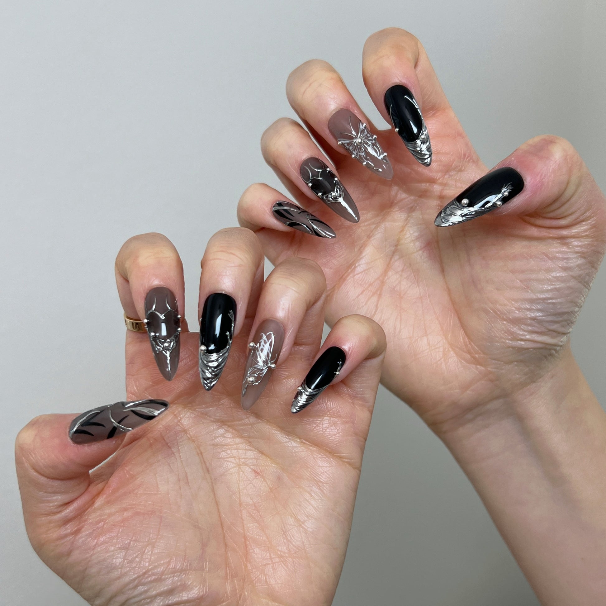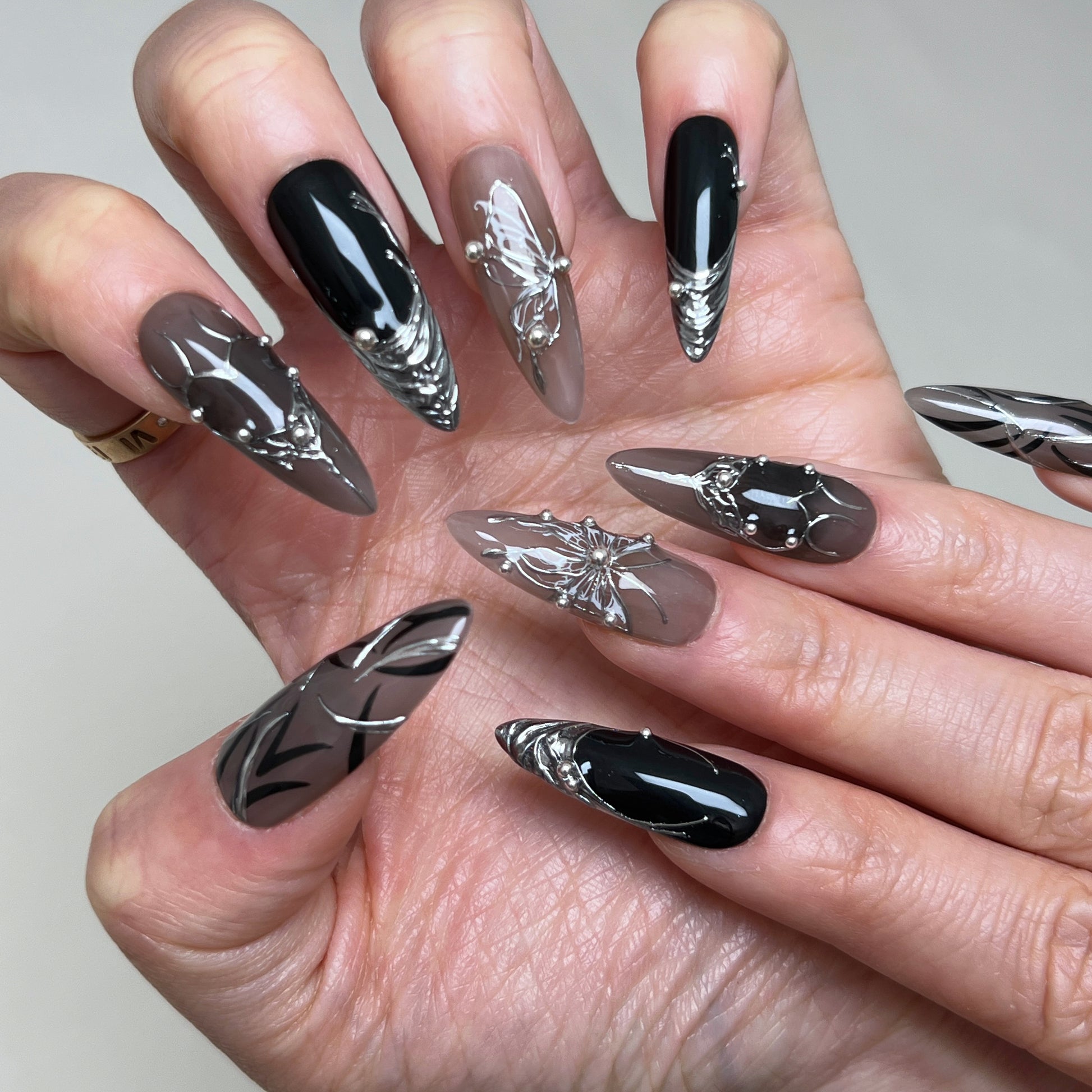 Thorned tells the story of beauty entwined with danger. Silver-lined butterflies spread their wings over a deep black base, glimmering with metallic light. Tiny steel beads and a barbed heart accent add a touch of rebellion, blending elegance with a hint of forbidden desire. Like love that cuts and heals all at once—dark, delicate, and unforgettable.