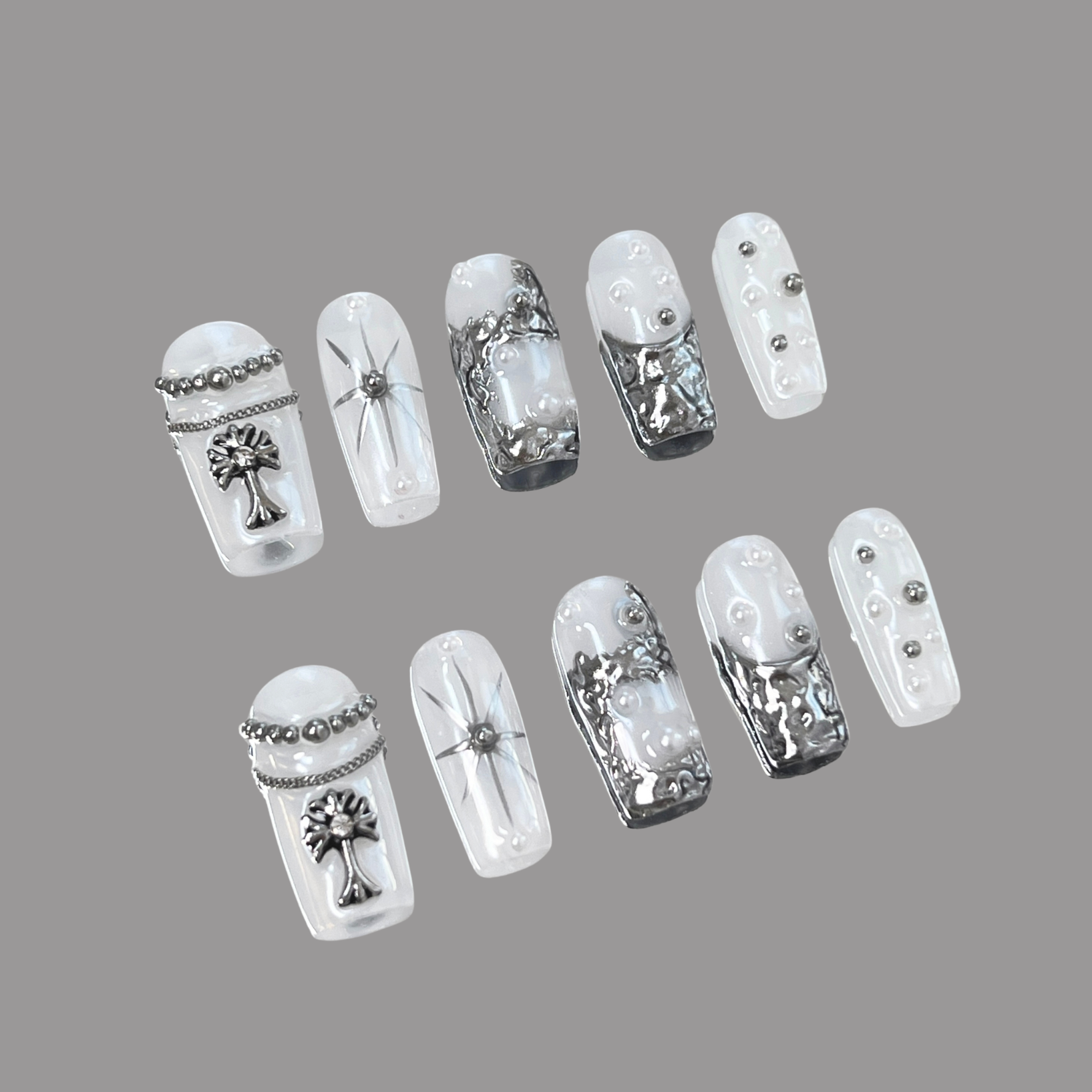 Celestia glows with the quiet power of the cosmos. Pearl-white tones meet mirrored silver and shifting aurora hues, creating a celestial radiance that feels both sacred and untamed. Silver stars and metallic lines trace a path across each nail, like constellations written in light—mysterious, graceful, and otherworldly.