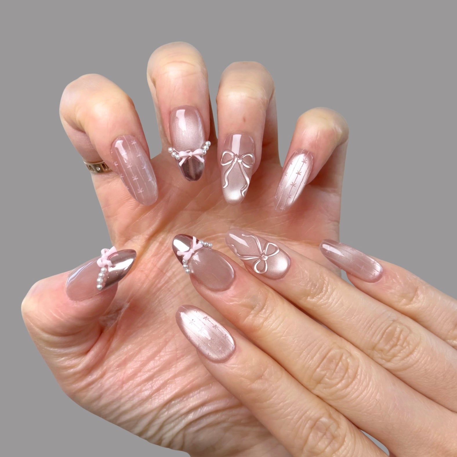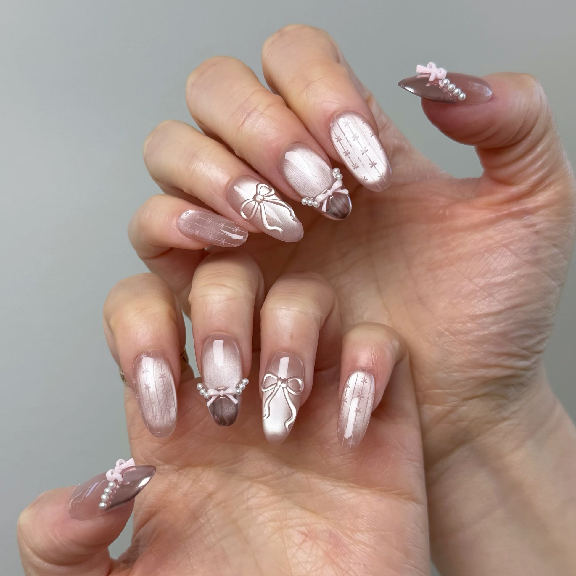 Delicate bows and pearls add a refined touch, while soft pink bow prints bring subtle sweetness. Elegant, feminine, and effortlessly charming.