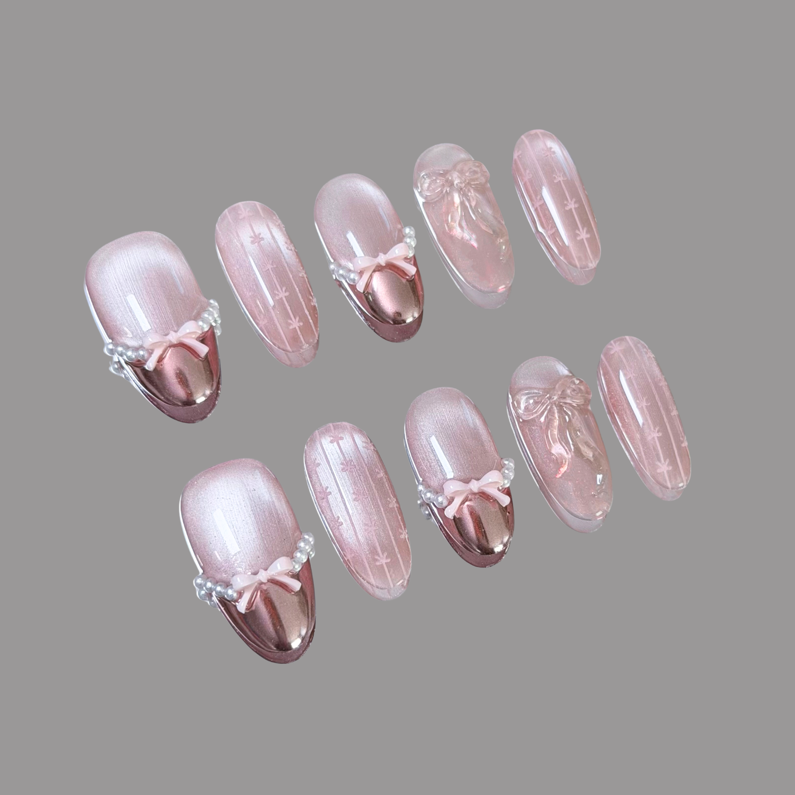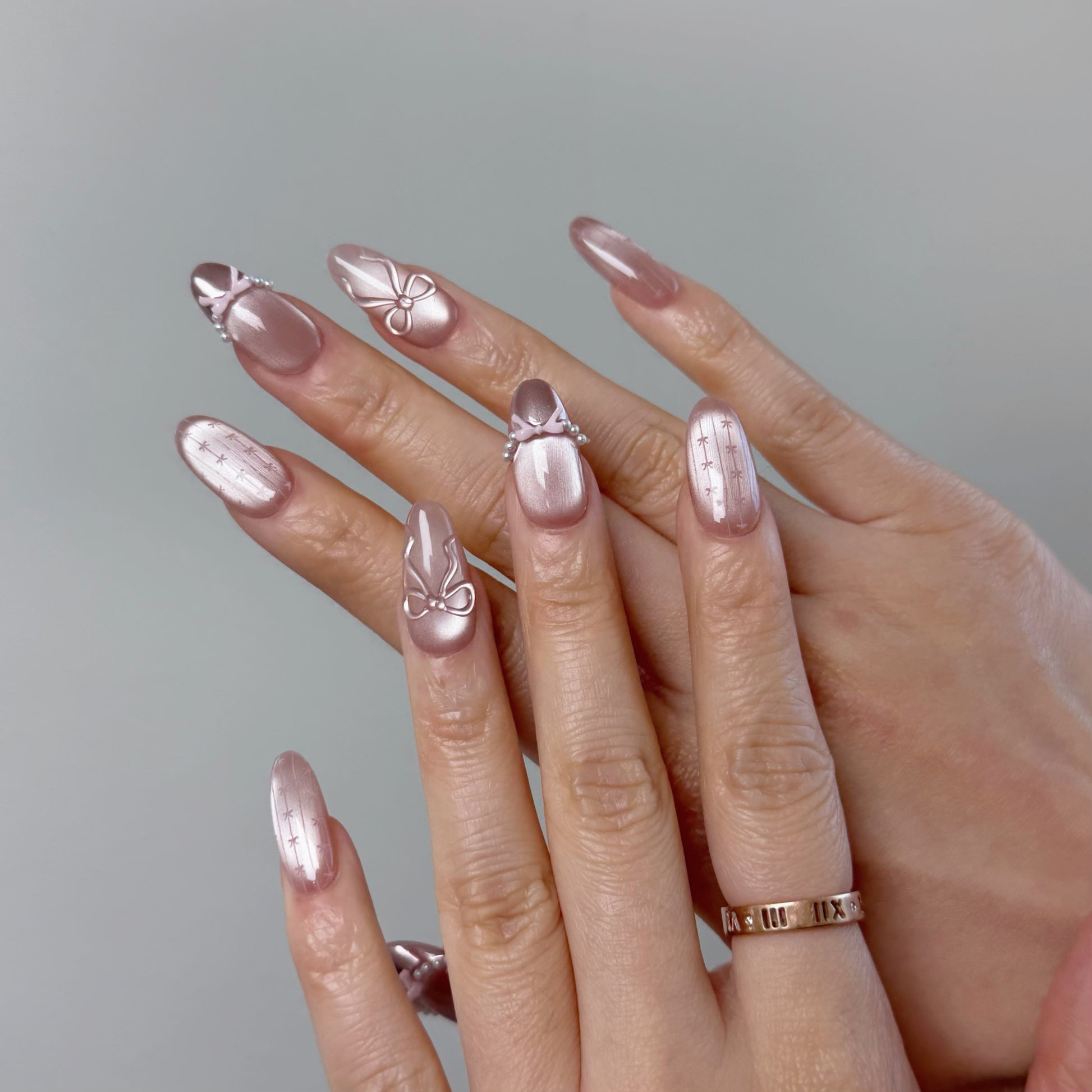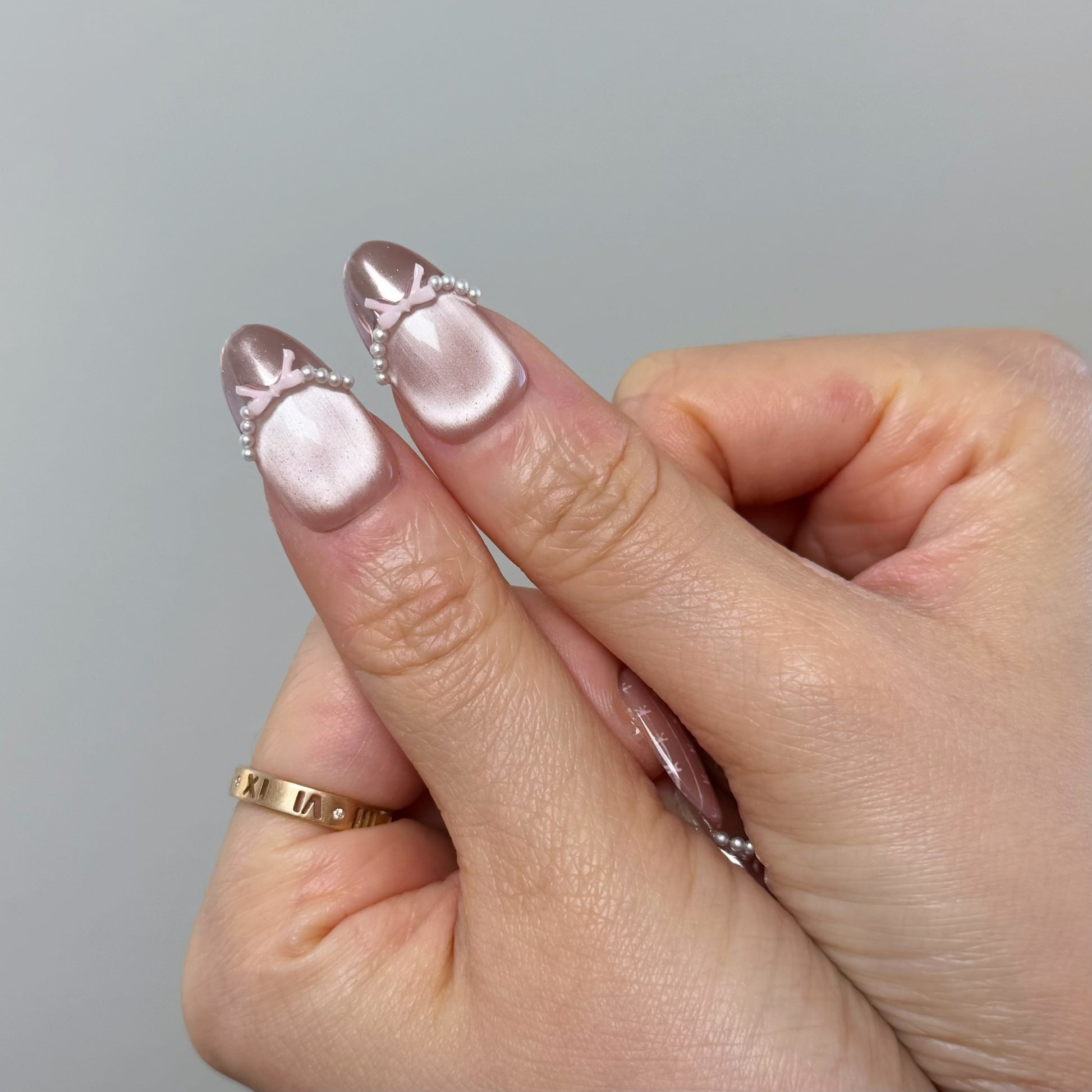 🎀A sheer nude cat-eye base paired with rose-gold chrome French tips.