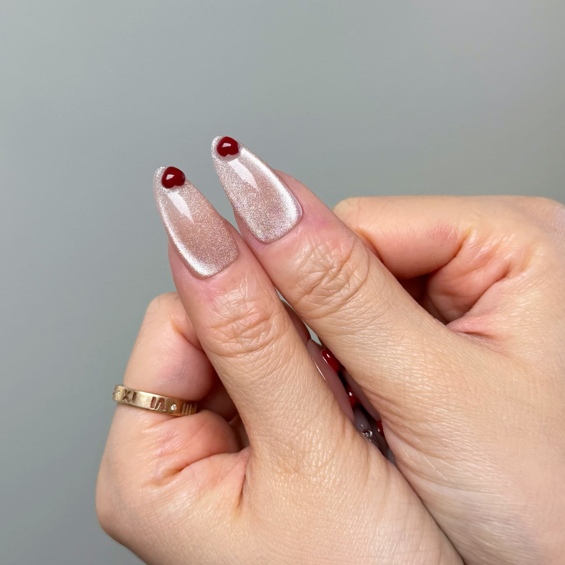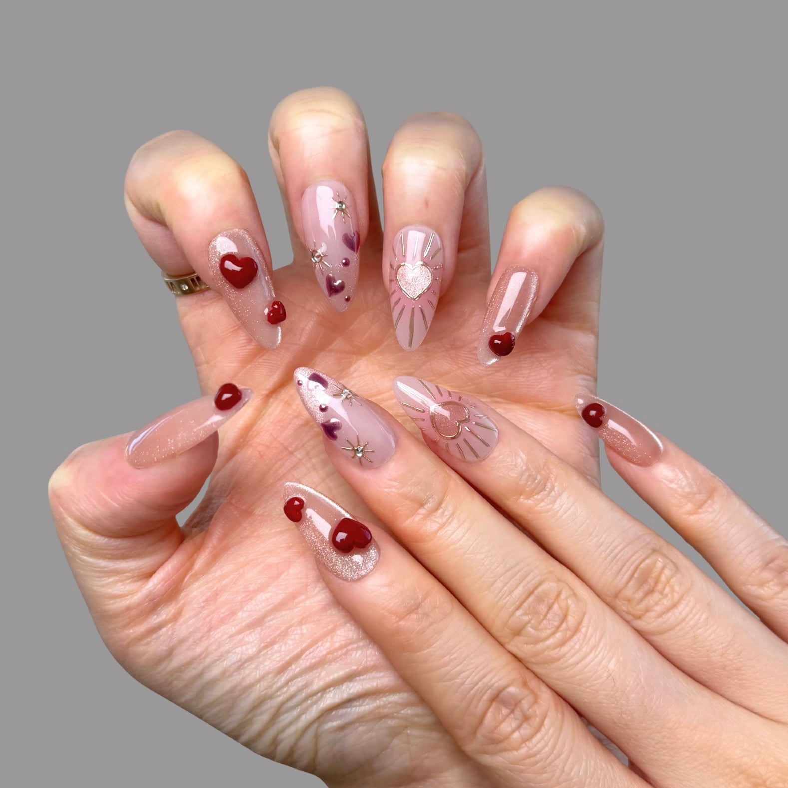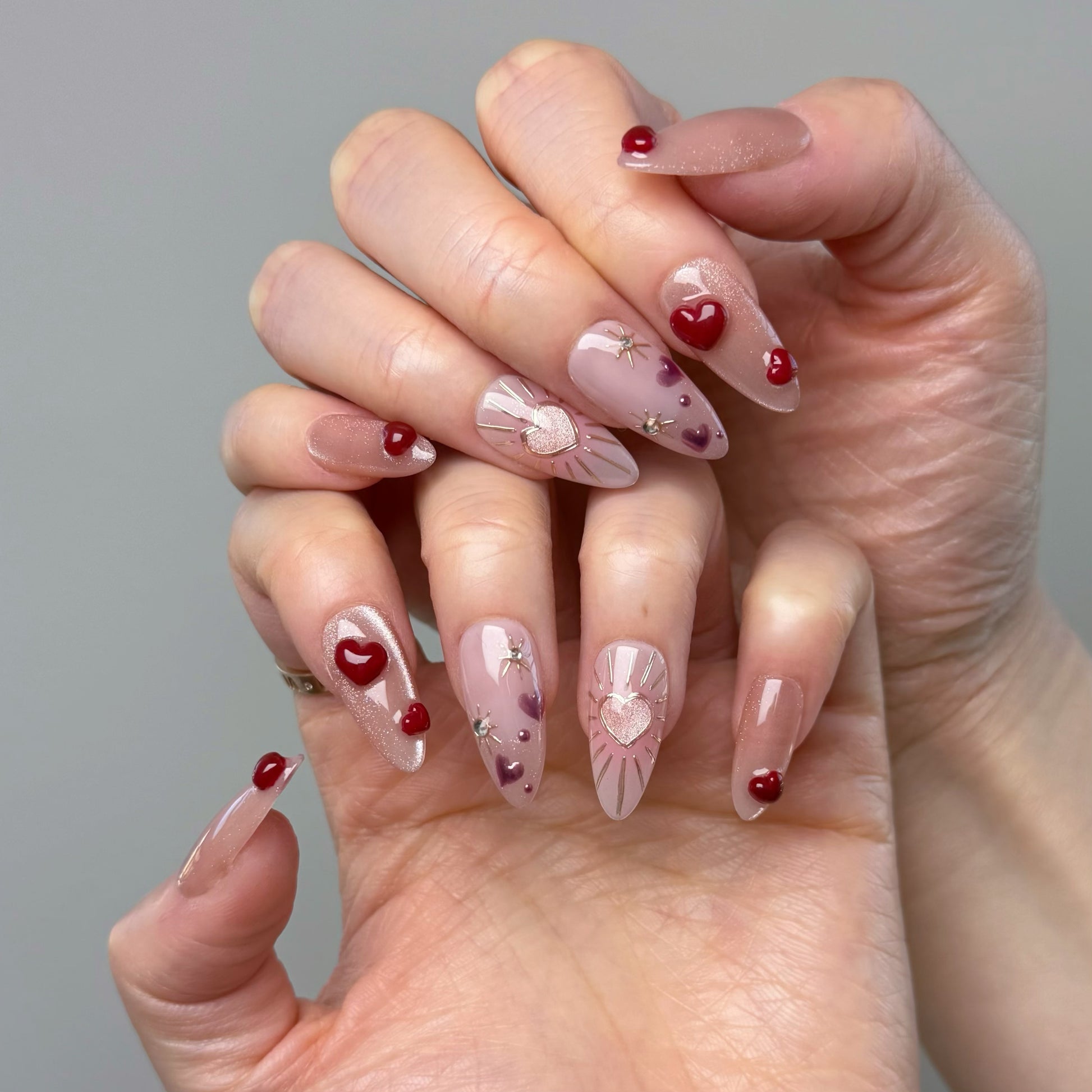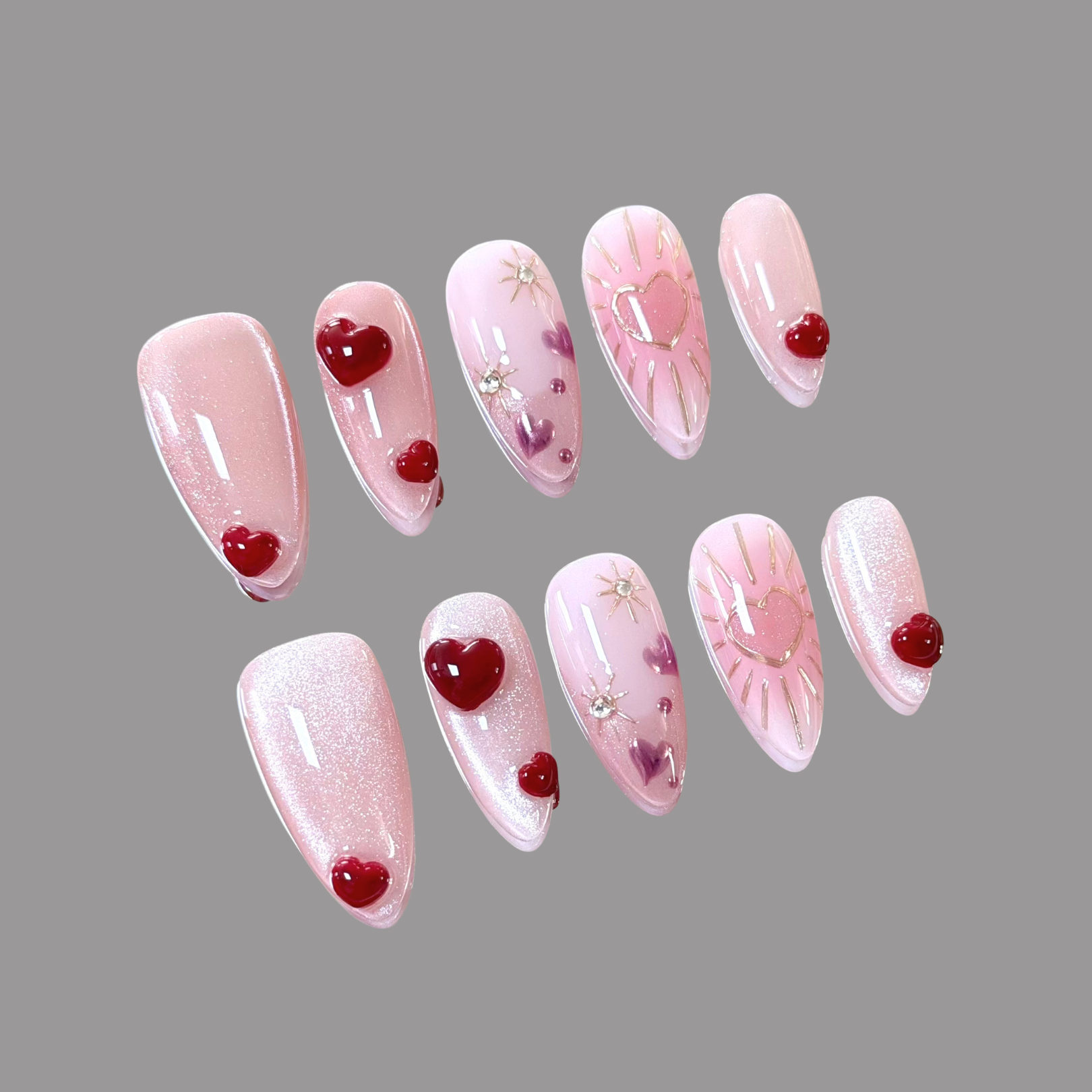 💕This design features a glowing pink cat-eye base layered with hand-sculpted 3D accents, creating depth and dimension across the set. The middle finger pairs a nude pink base with a delicate pink cat-eye French tip and subtle chrome detailing for a refined contrast. Golden chrome rays on the ring finger add a radiant focal point, giving the entire set a halo-like glow.