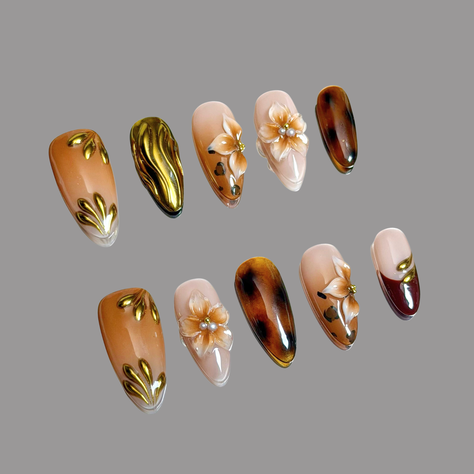 🍁Warm golden tones melt into rich browns in Molten, a Maillard-inspired set designed for the glow of autumn. The 3D chrome lines ripple like liquid gold, paired with hand-crafted brown florals and soft, smoky leopard details. A luxe, earthy harmony — perfect for those who love understated glamour with seasonal warmth.